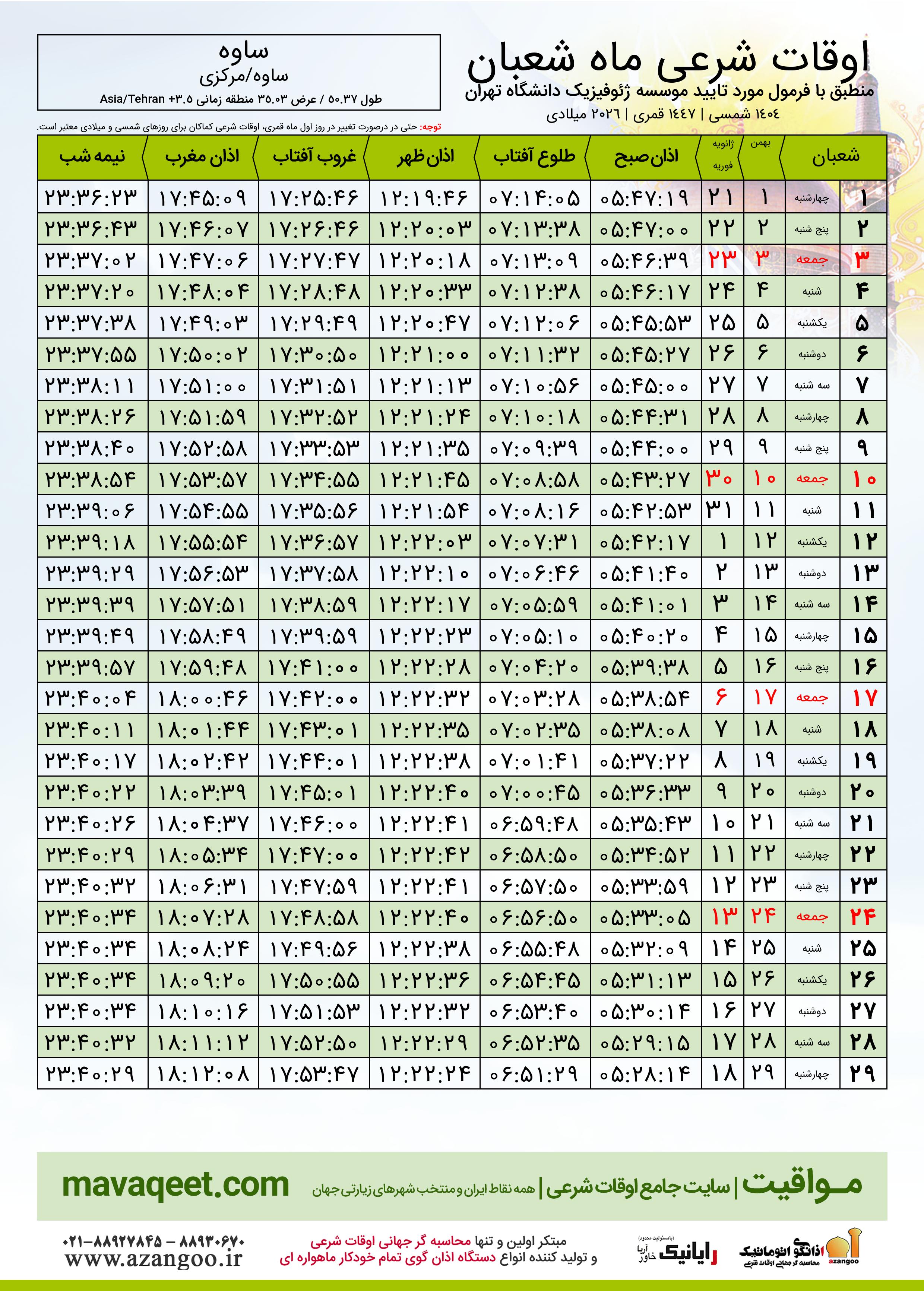 اوقات شرعی ماه شعبان ١٤٤٧ هـ.ق شهر ساوه بر