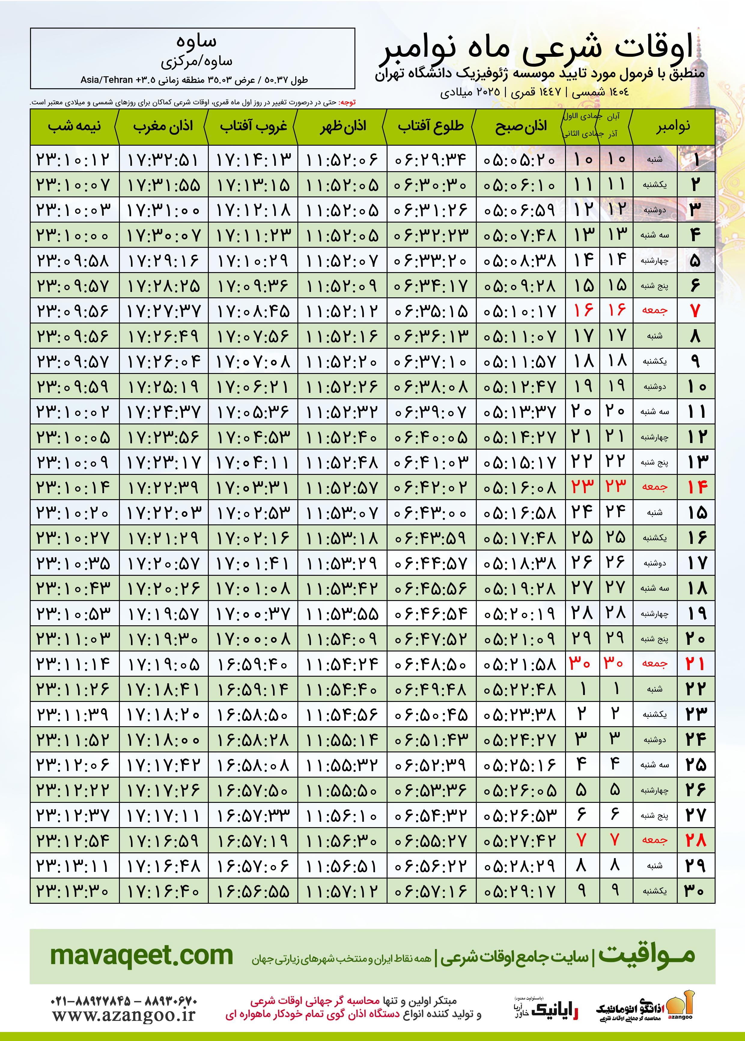 جدول اوقات شرعی نوامبر ٢٠٢٥ میلادی شهر ساوه