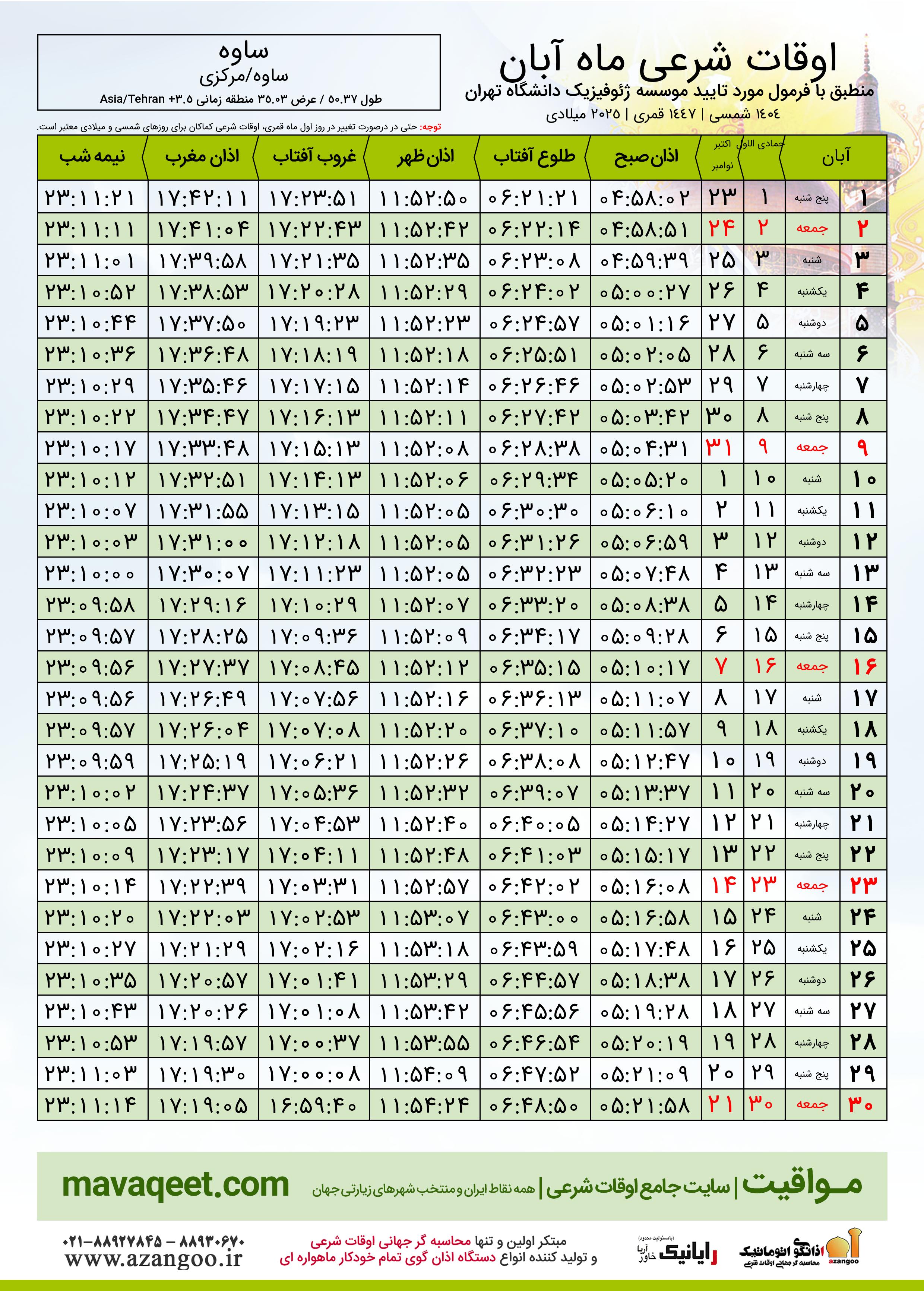 اوقات شرعی آبان ١٤٠٤ شمسی شهر ساوه
