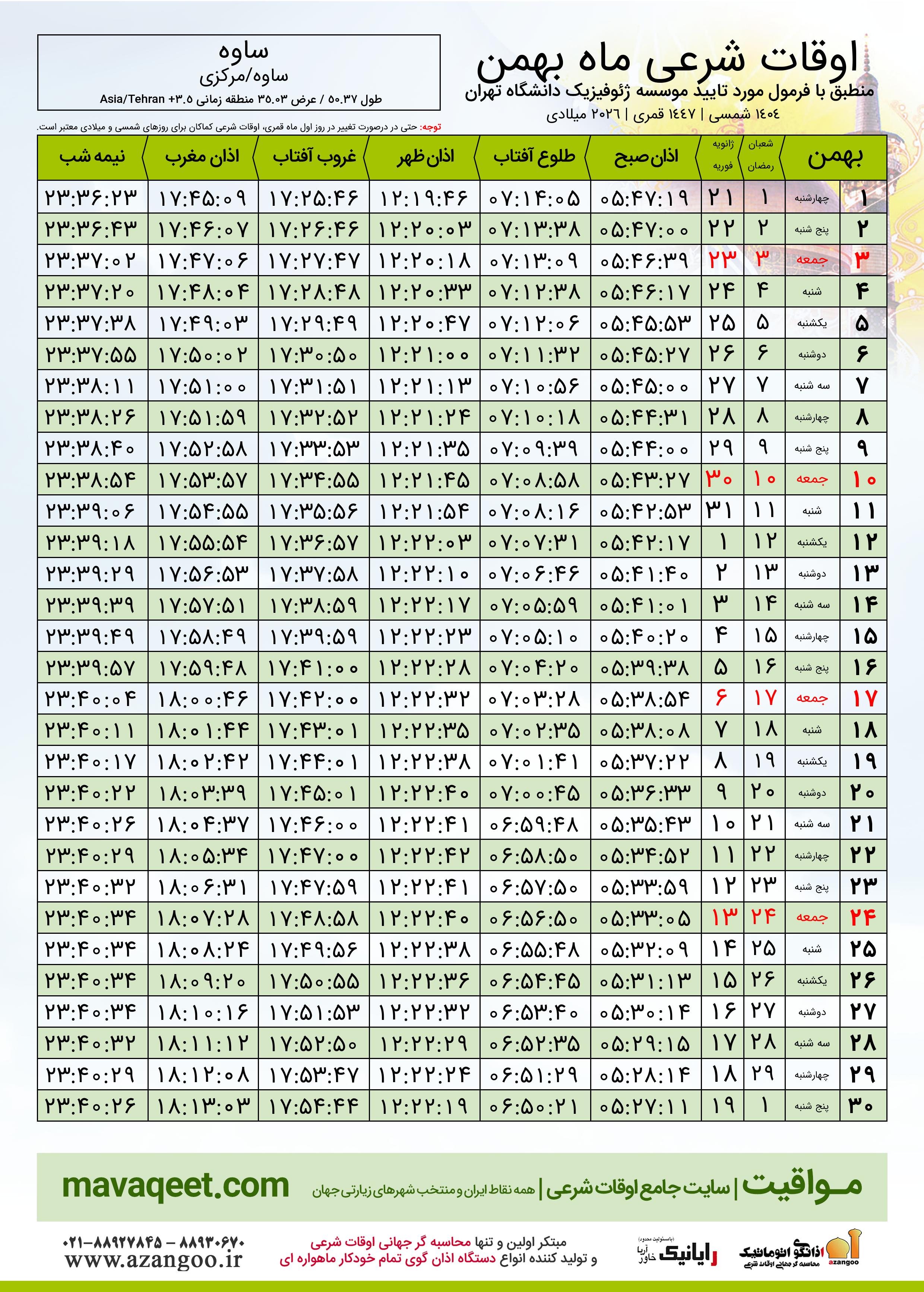دانلود اوقات شرعی بهمن ٠٤ - ١٤٠٤ شهر ساوه