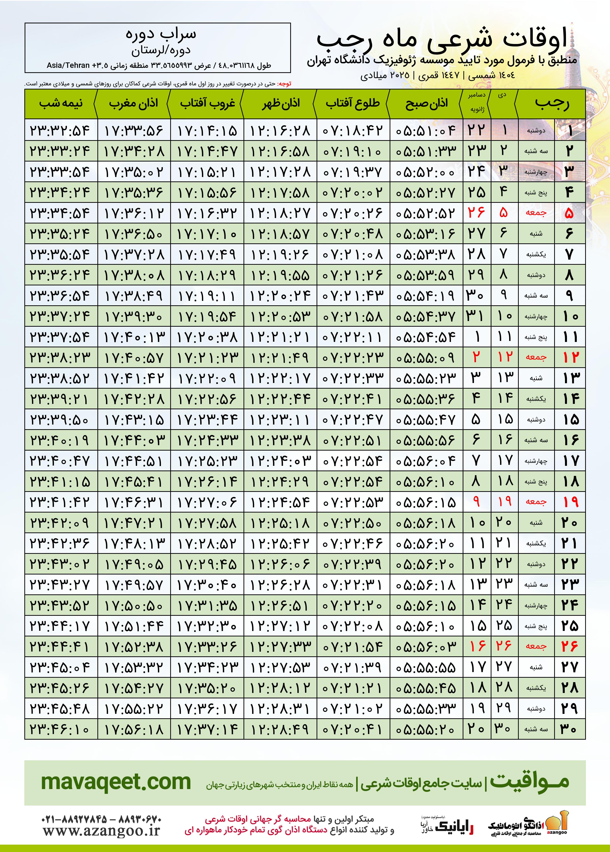 اوقات شرعی ماه رجب ١٤٤٧ هـ.ق شهر سراب دوره بر