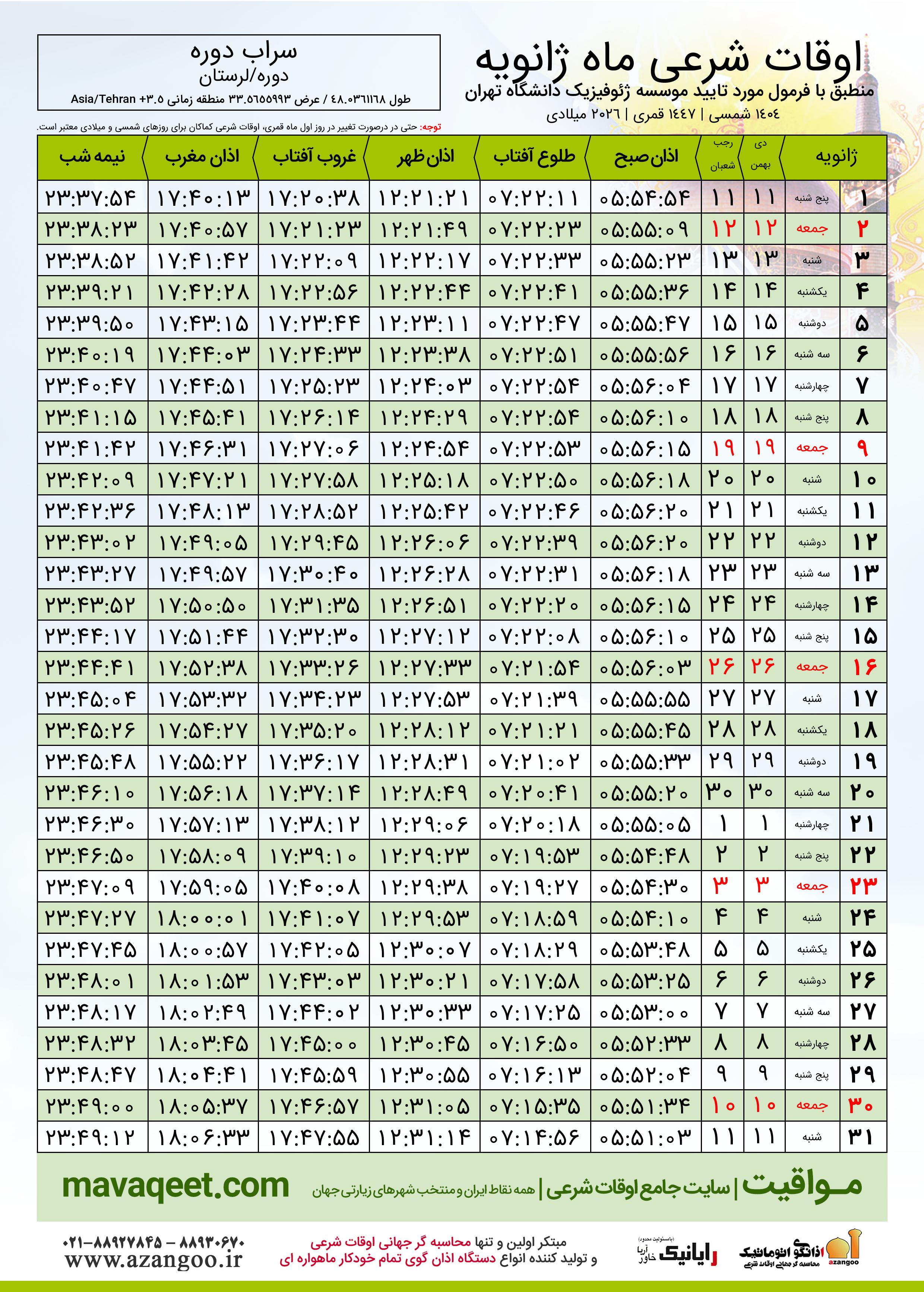 اوقات شرعی ژانویه ٢٠٢٦ میلادی شهر سراب دوره
