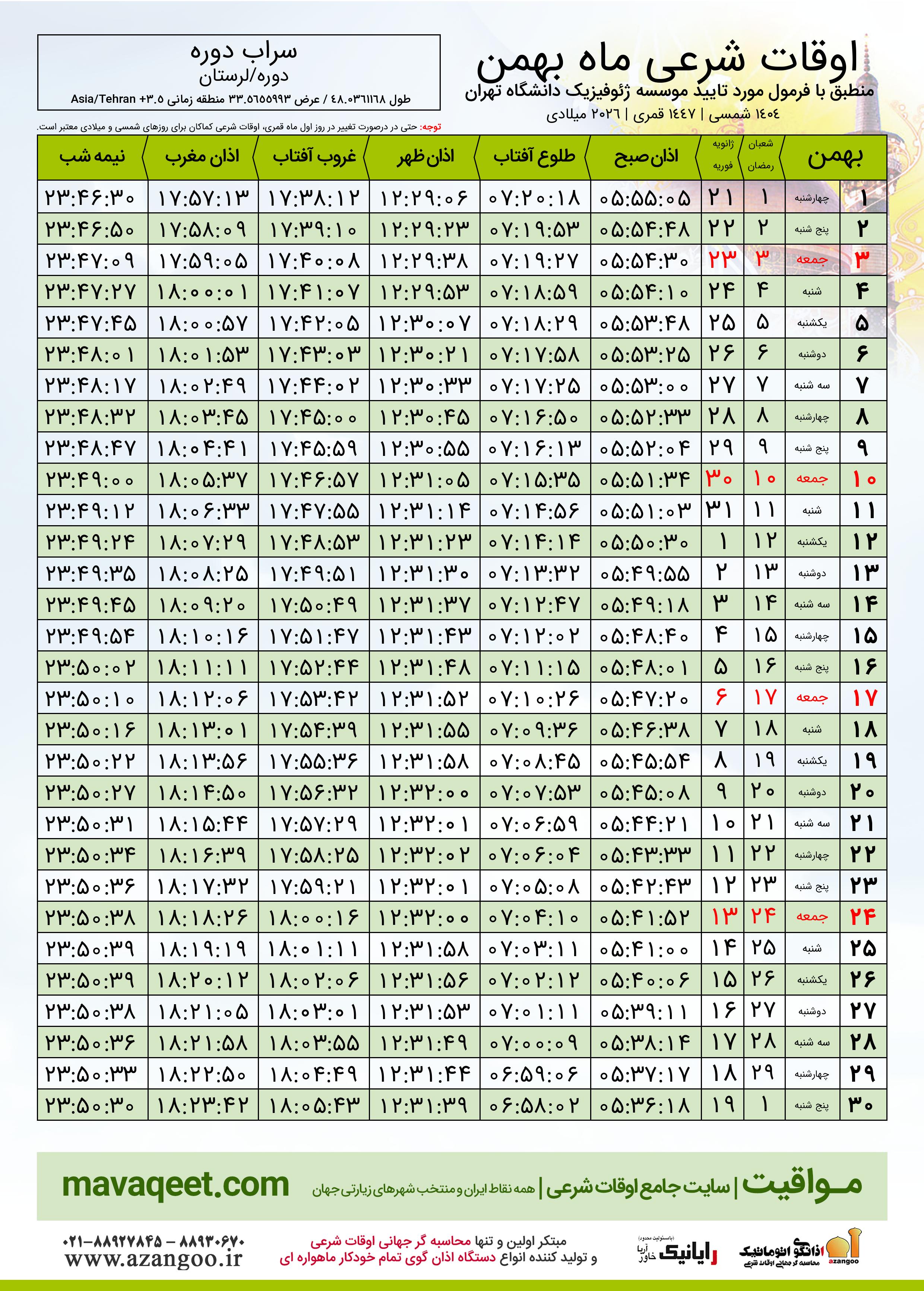 اوقات شرعی بهمن ١٤٠٤ شمسی شهر سراب دوره
