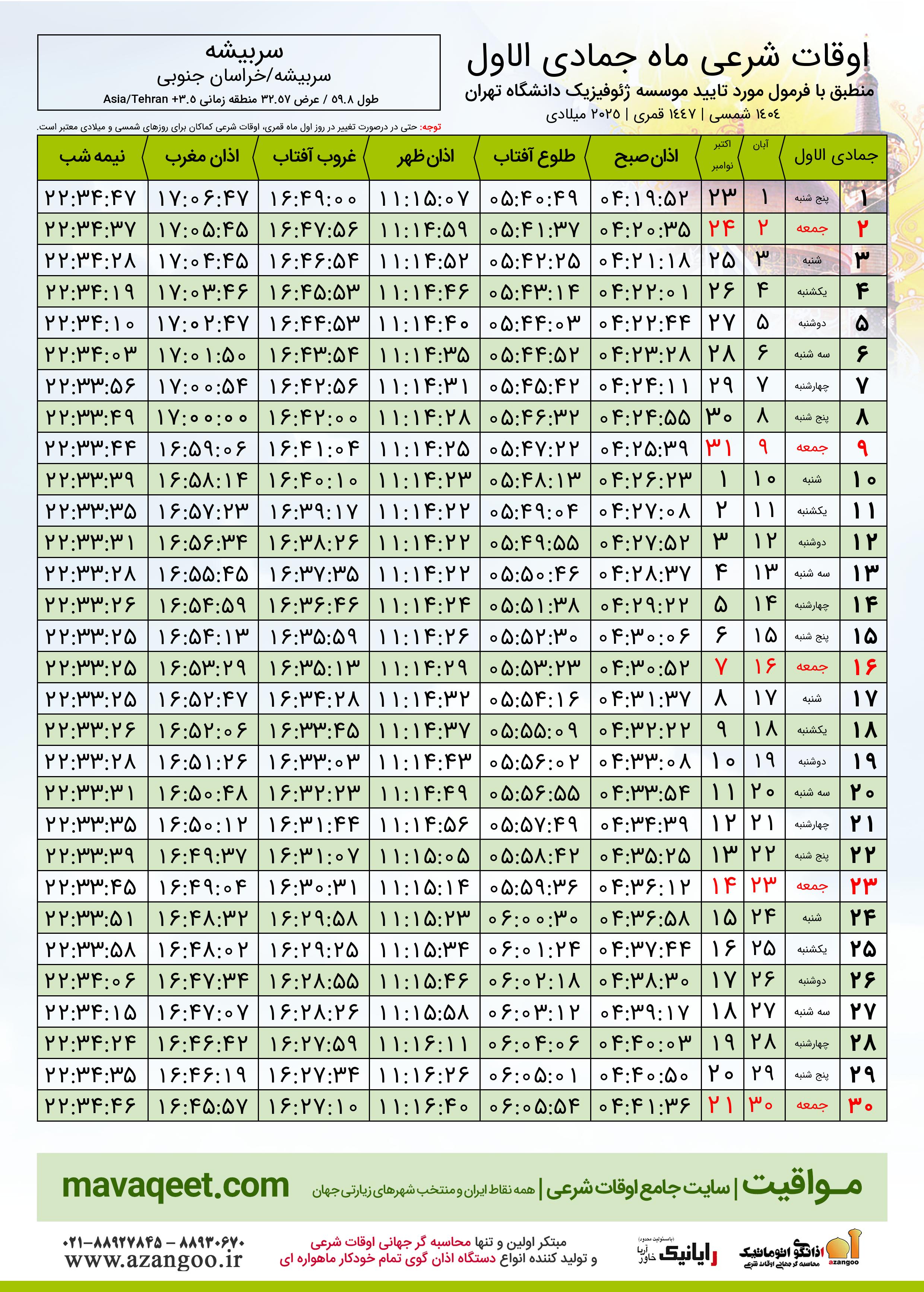 جدول اوقات شرعی جمادی الاول ١٤٤٧ قمری شهر سربیشه