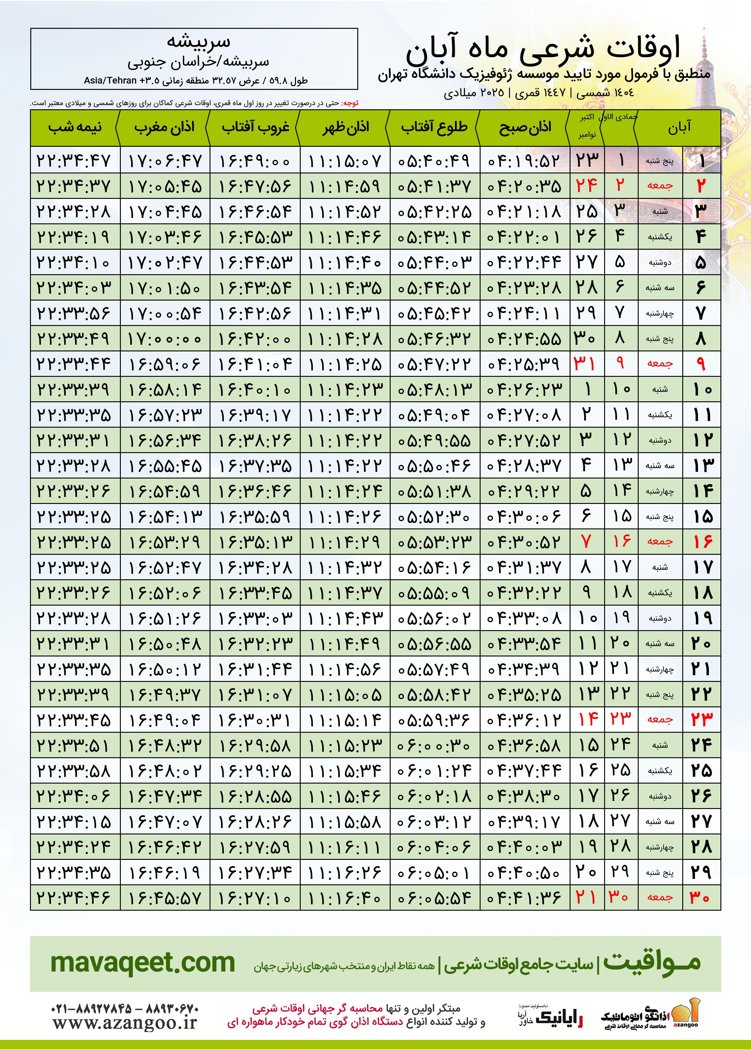 جدول اوقات شرعی آبان ١٤٠٤ شمسی شهر سربیشه