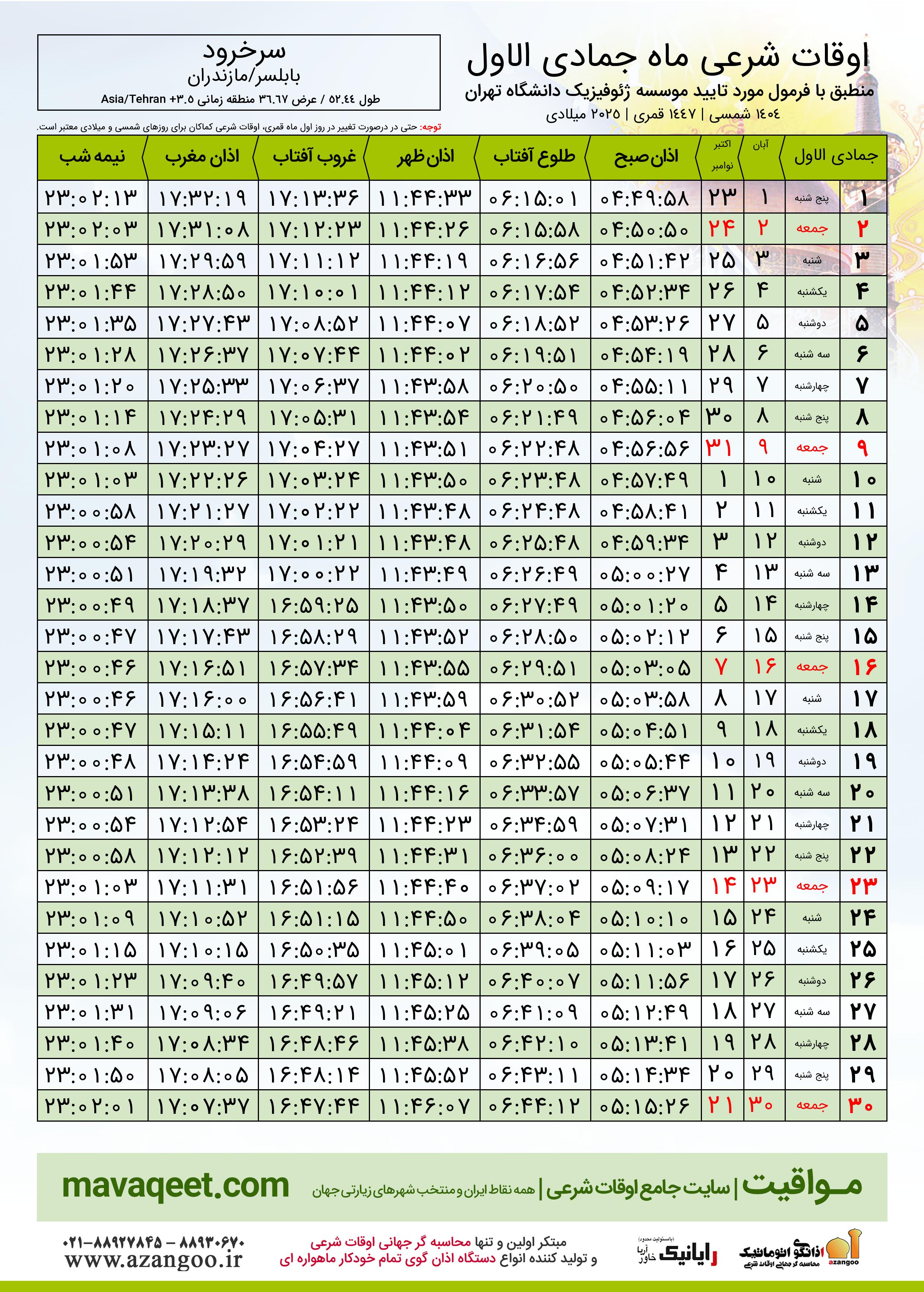 اوقات شرعی ماه جمادی الاول ١٤٤٧ هـ.ق شهر سرخرود بر