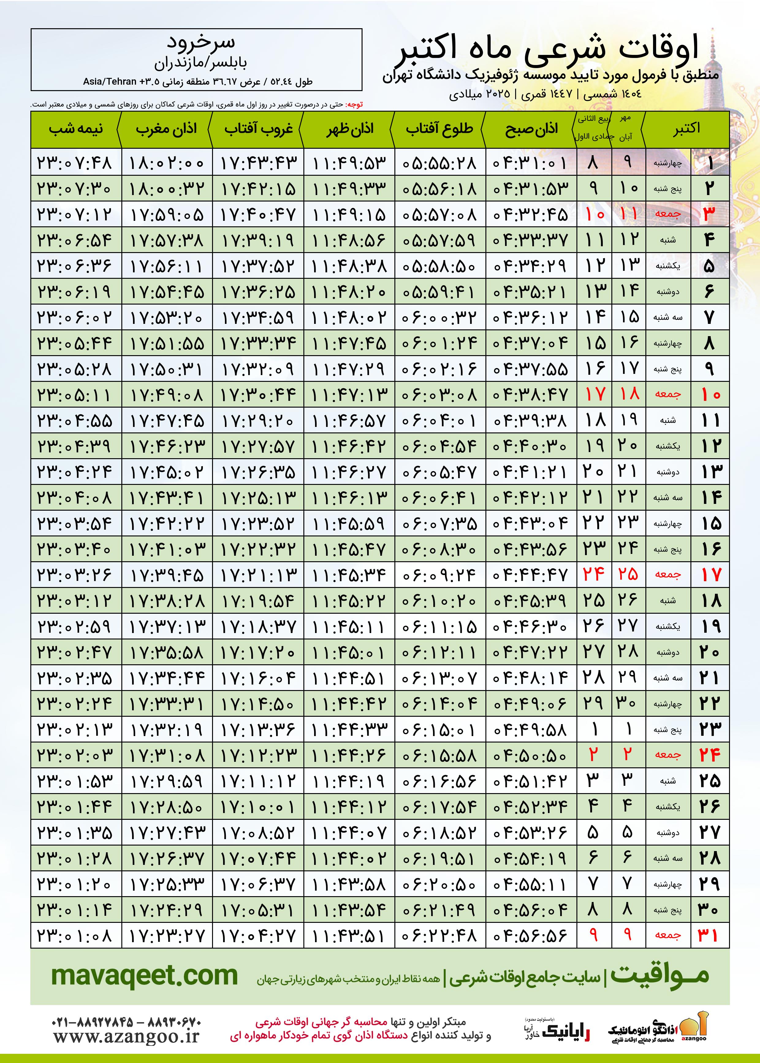 جدول اوقات شرعی اکتبر ٢٠٢٥ میلادی شهر سرخرود
