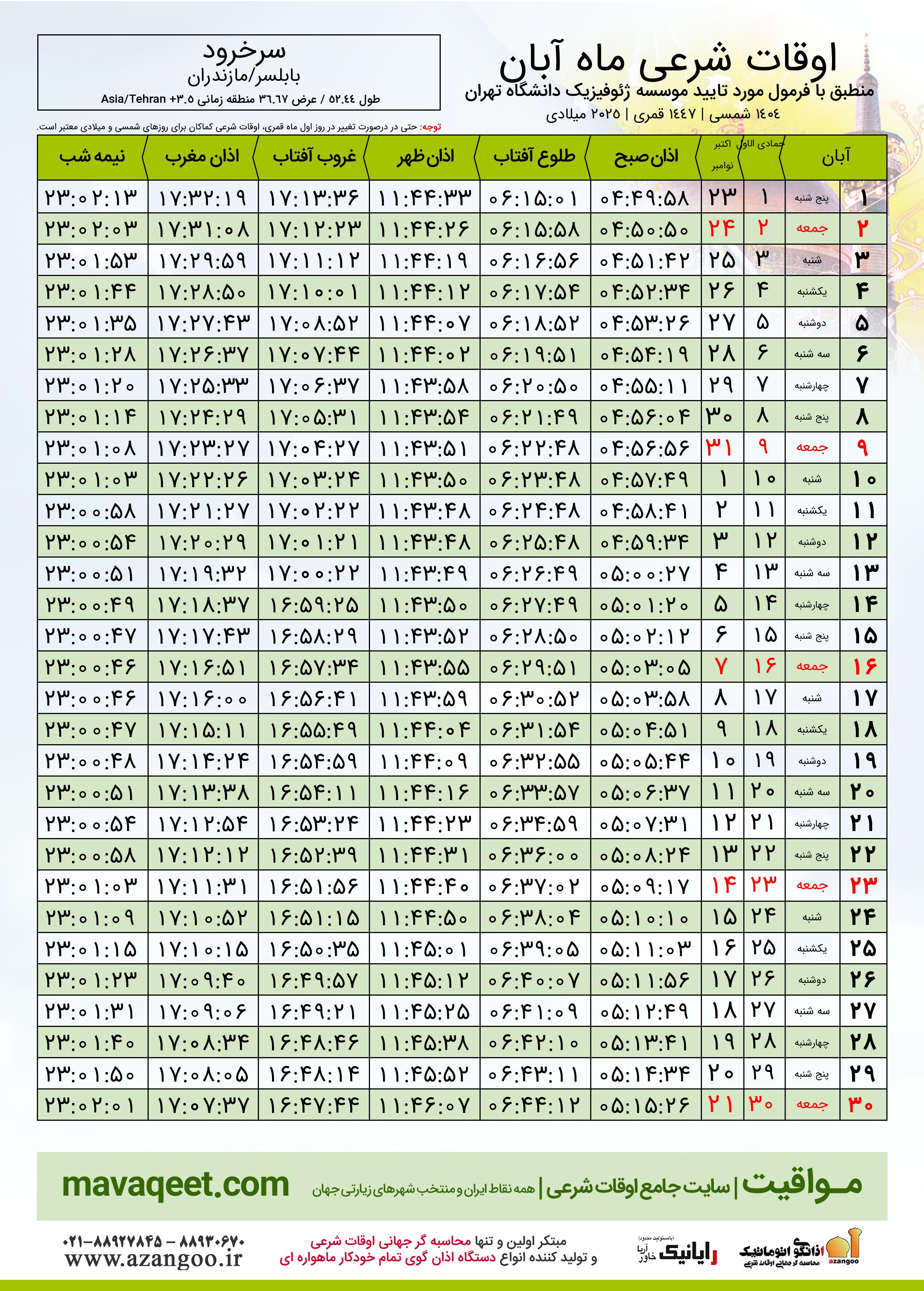 اوقات شرعی آبان ١٤٠٤ شمسی شهر سرخرود