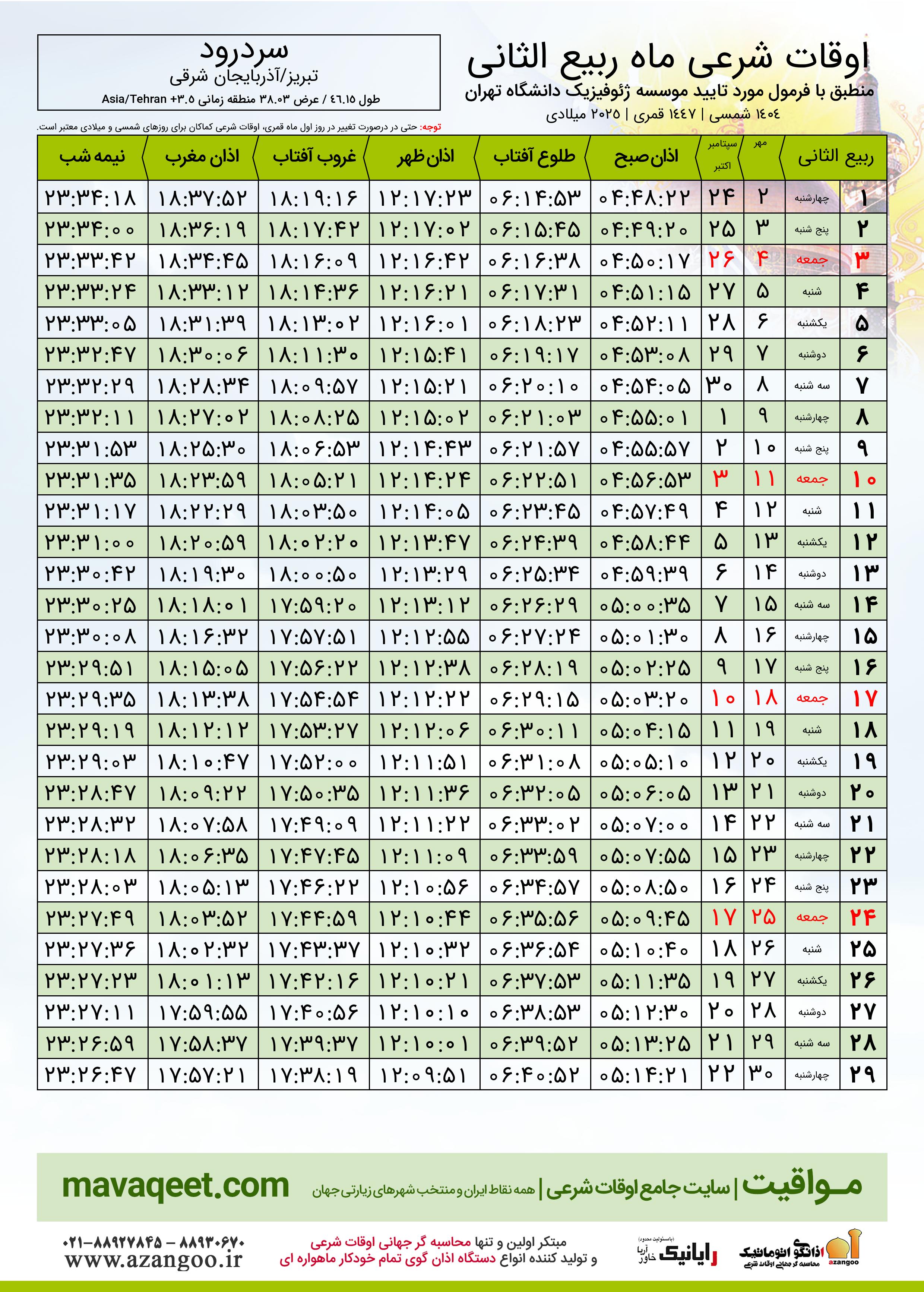 اوقات شرعی ماه ربیع الثانی ١٤٤٧ هـ.ق شهر سردرود بر