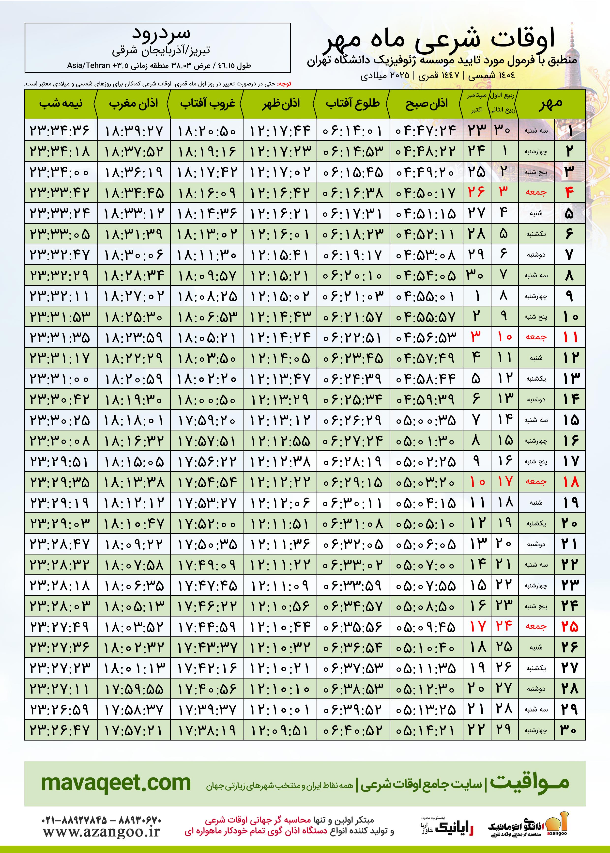 اوقات شرعی مهر ١٤٠٤ شمسی شهر سردرود