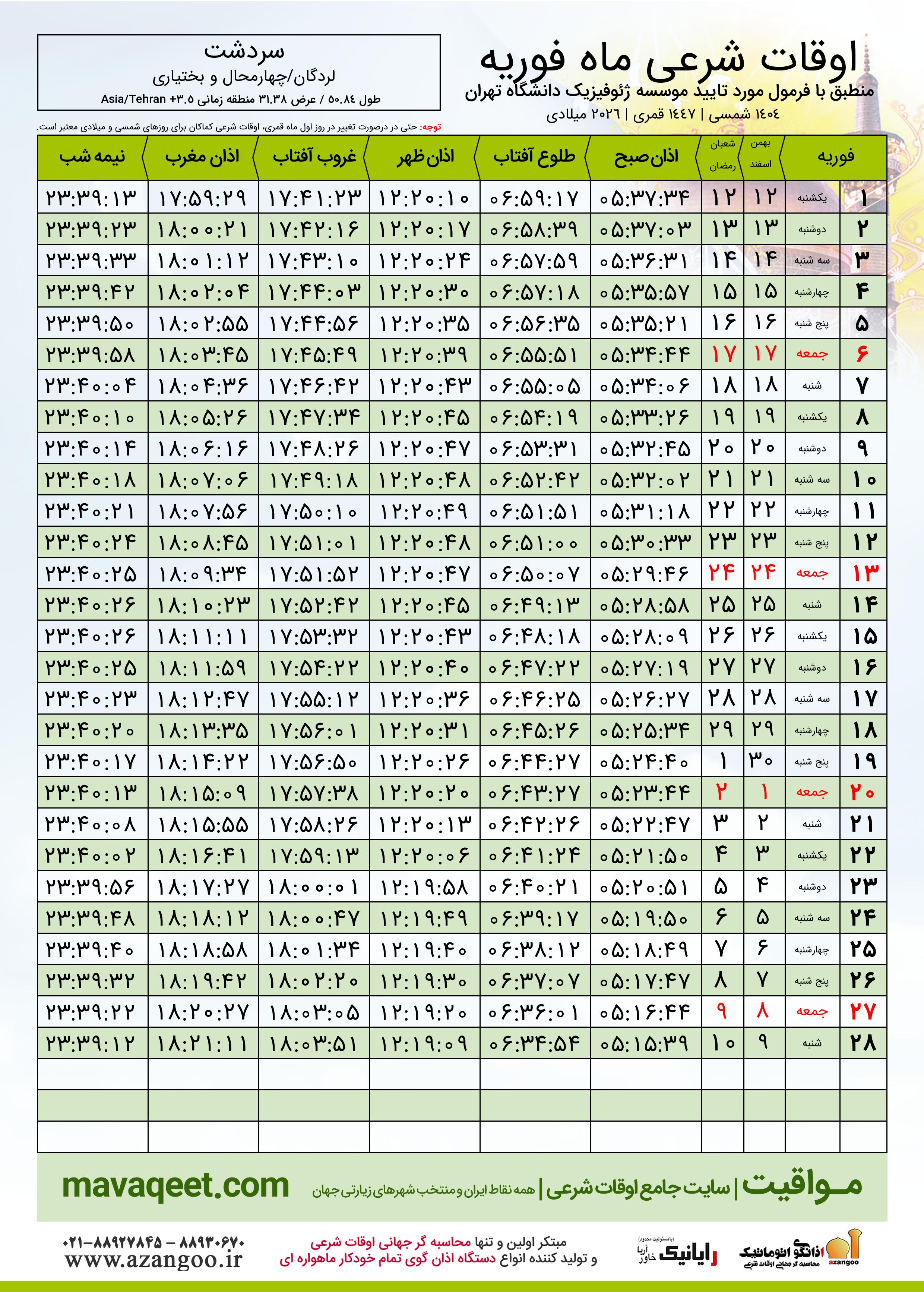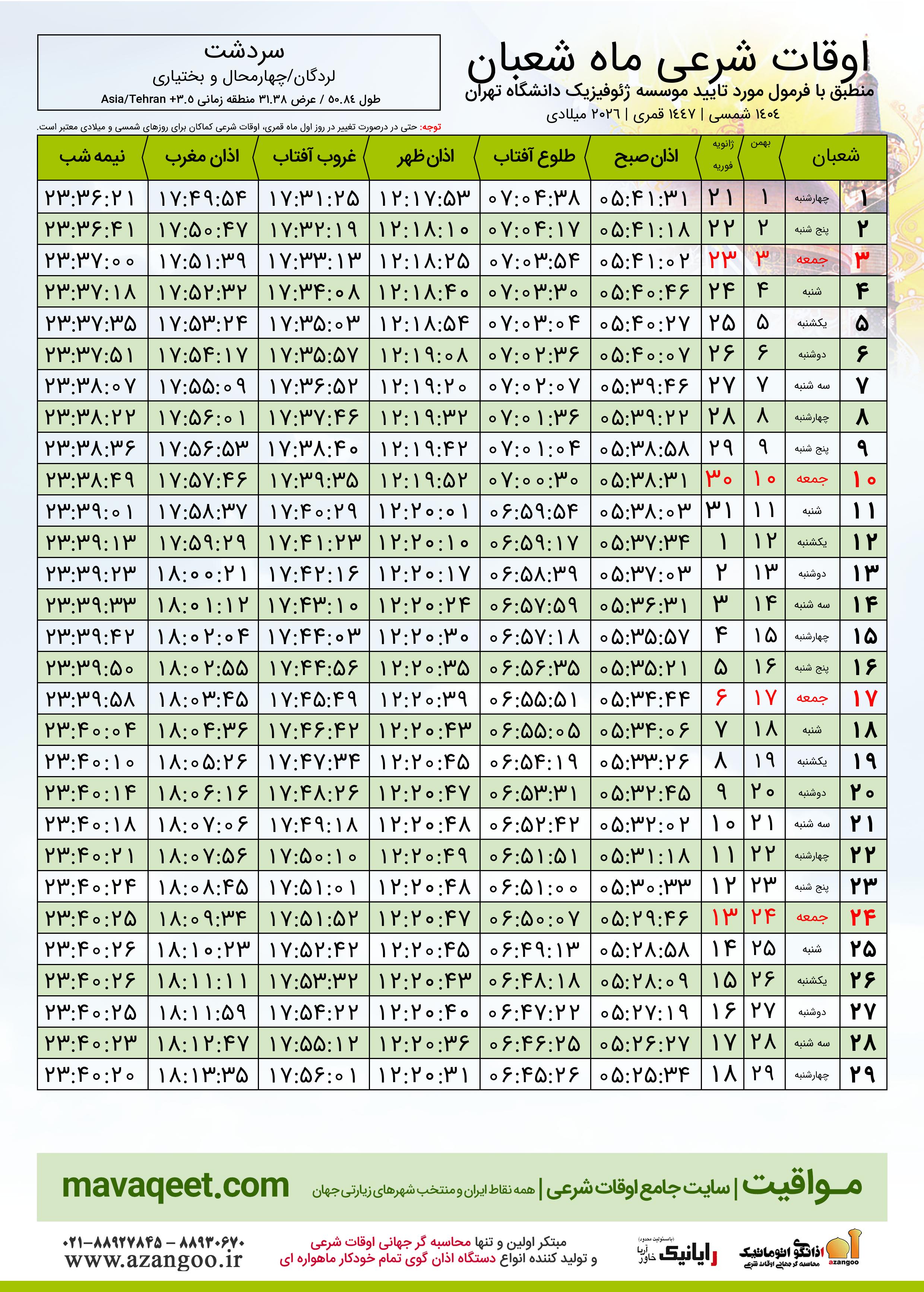 اوقات شرعی ماه رمضان شهر سردشت ١٤٠٤ - ٠٤ شمسی | ٢٠٢٦ میلادی