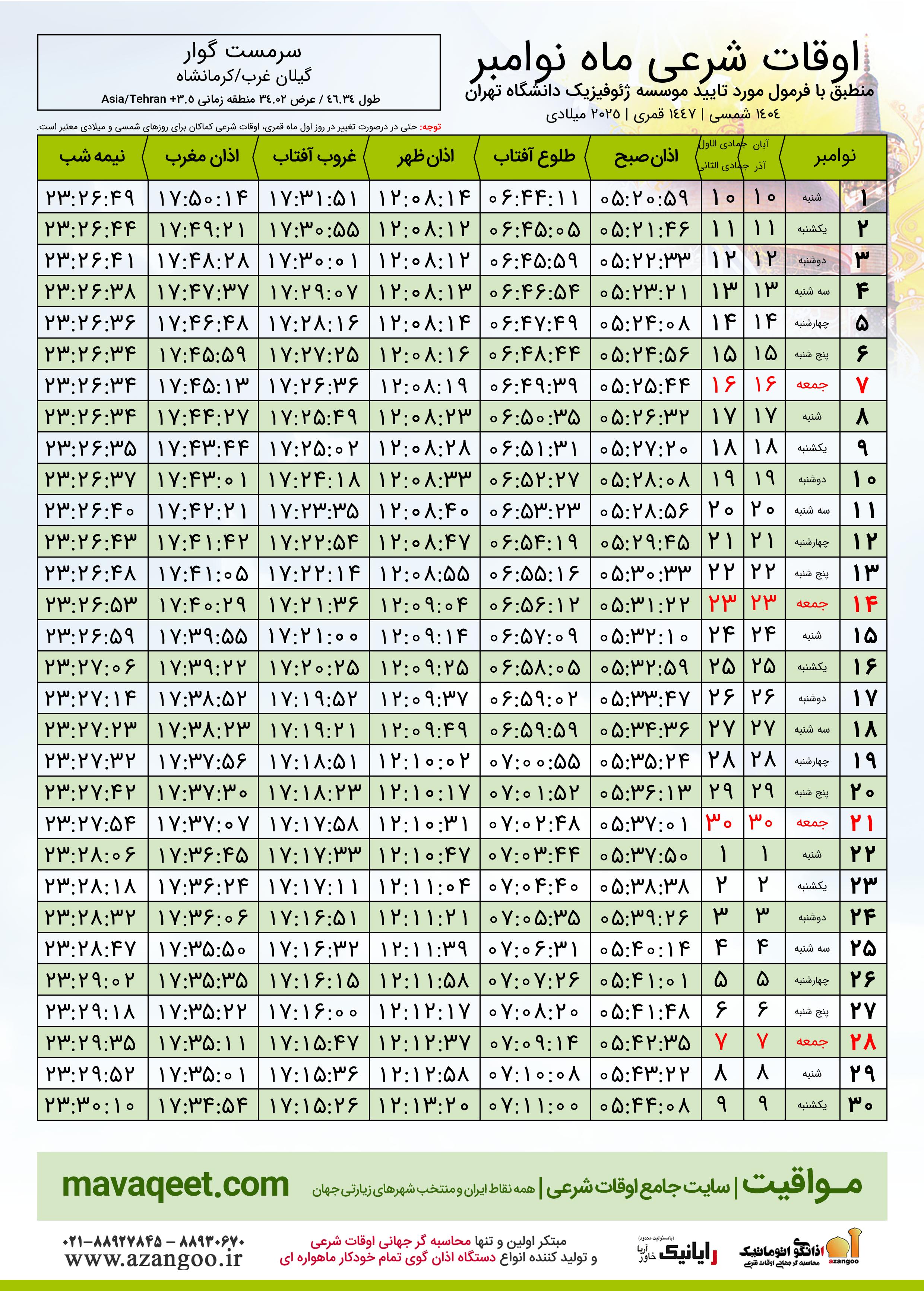 جدول اوقات شرعی نوامبر ٢٠٢٥ میلادی شهر سرمست گوار