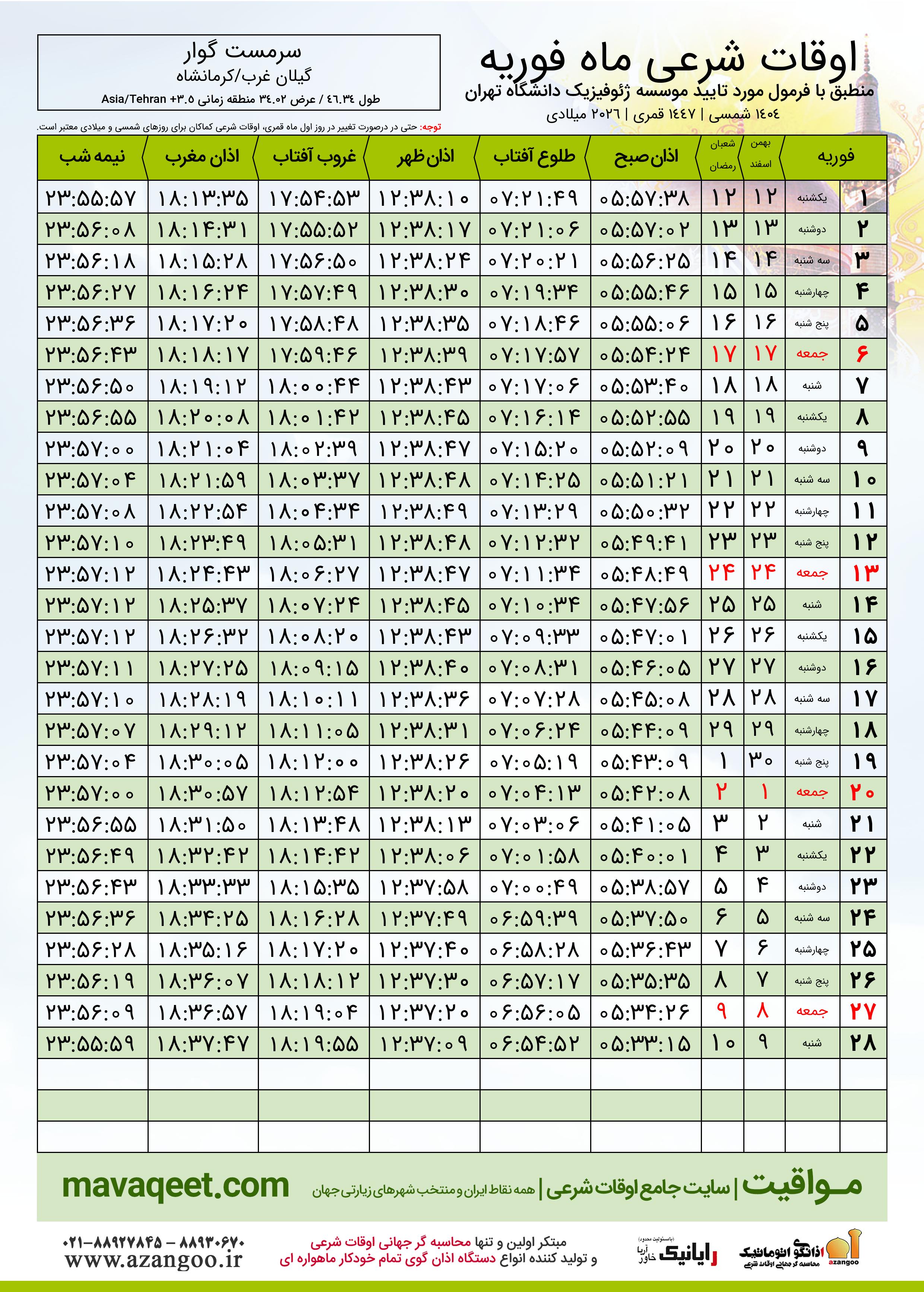 اوقات شرعی فوریه ٢٠٢٦ میلادی شهر سرمست گوار