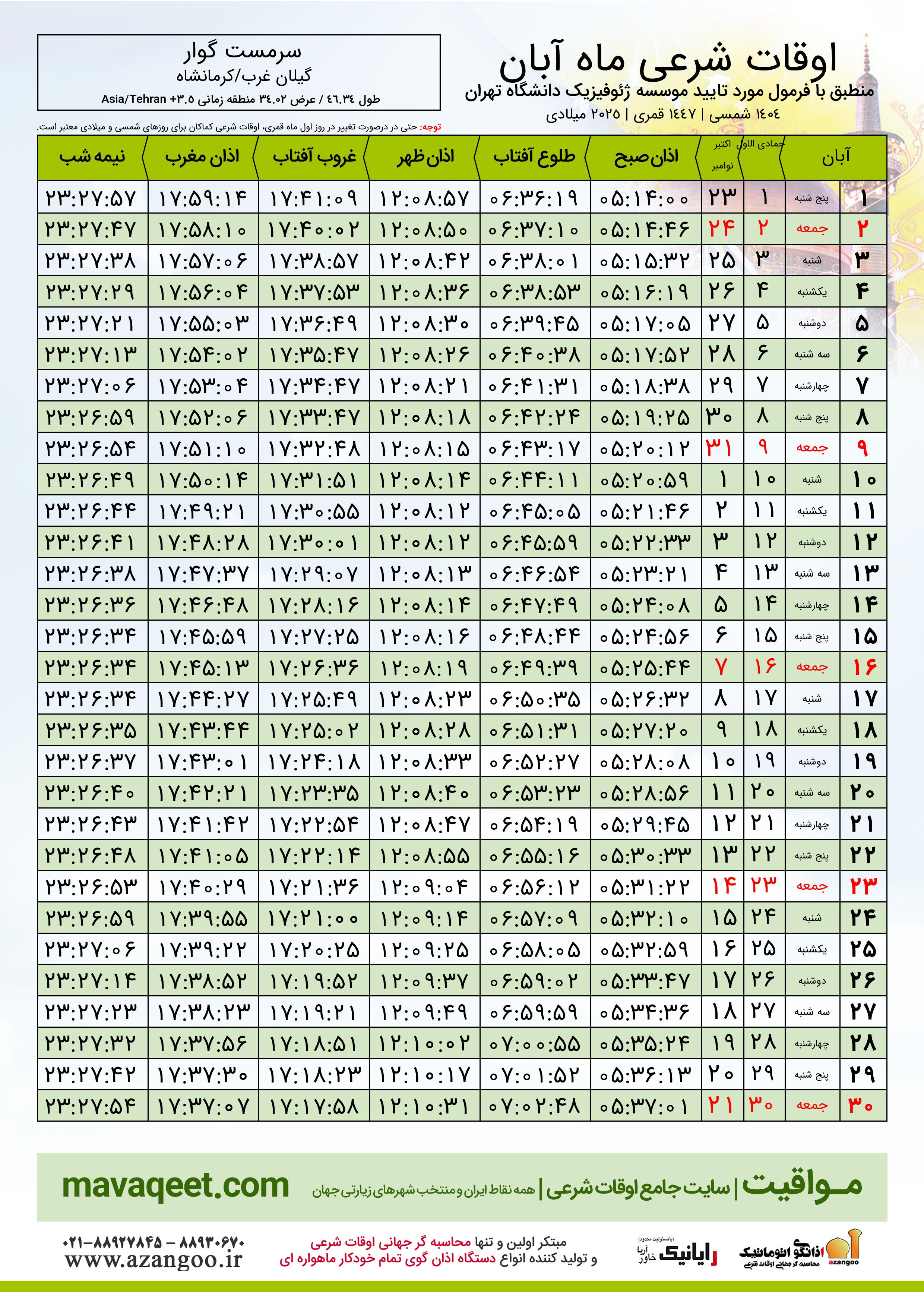 جدول اوقات شرعی آبان ١٤٠٤ شمسی شهر سرمست گوار