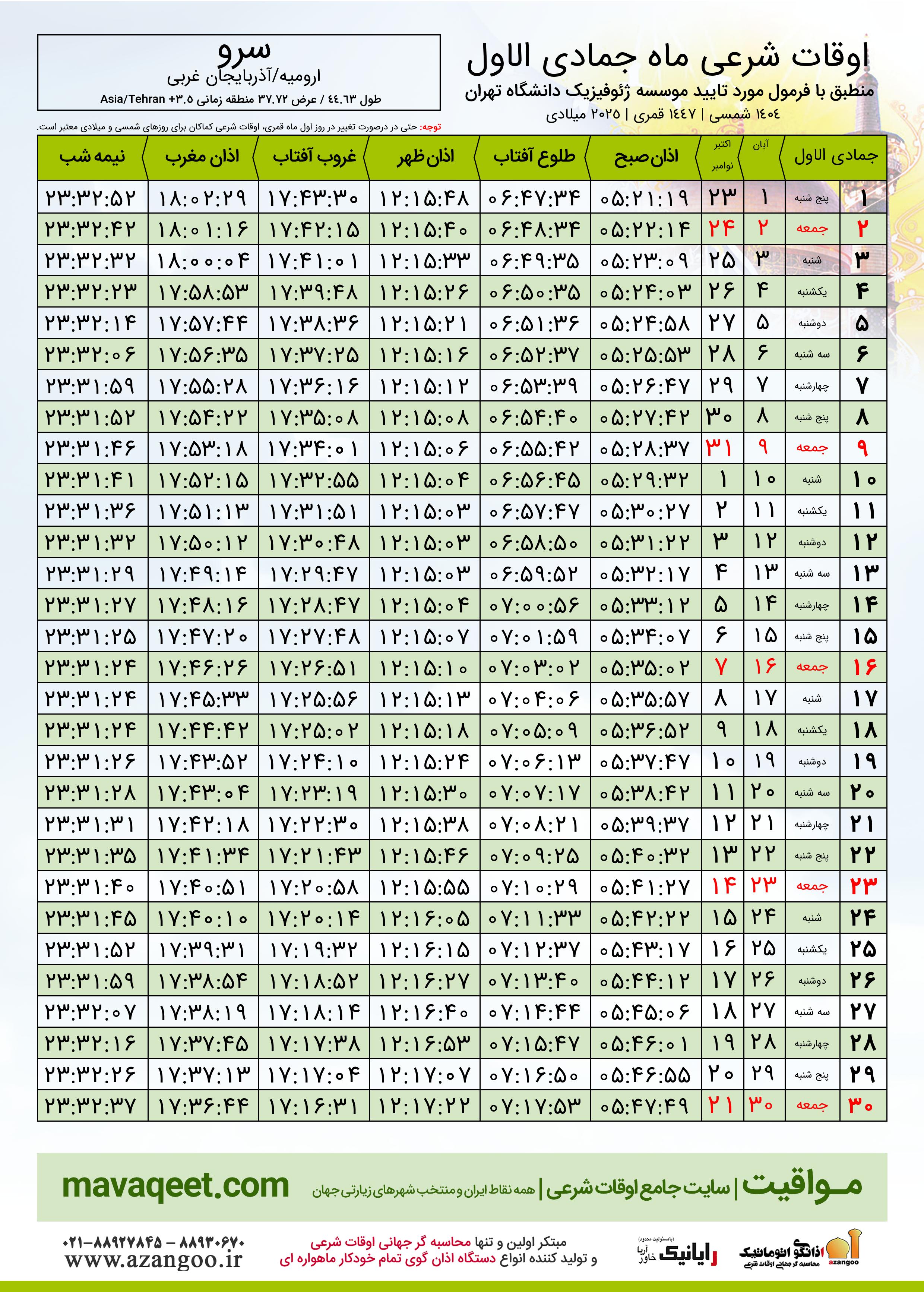 اوقات شرعی ماه جمادی الاول ١٤٤٧ هـ.ق شهر سرو بر