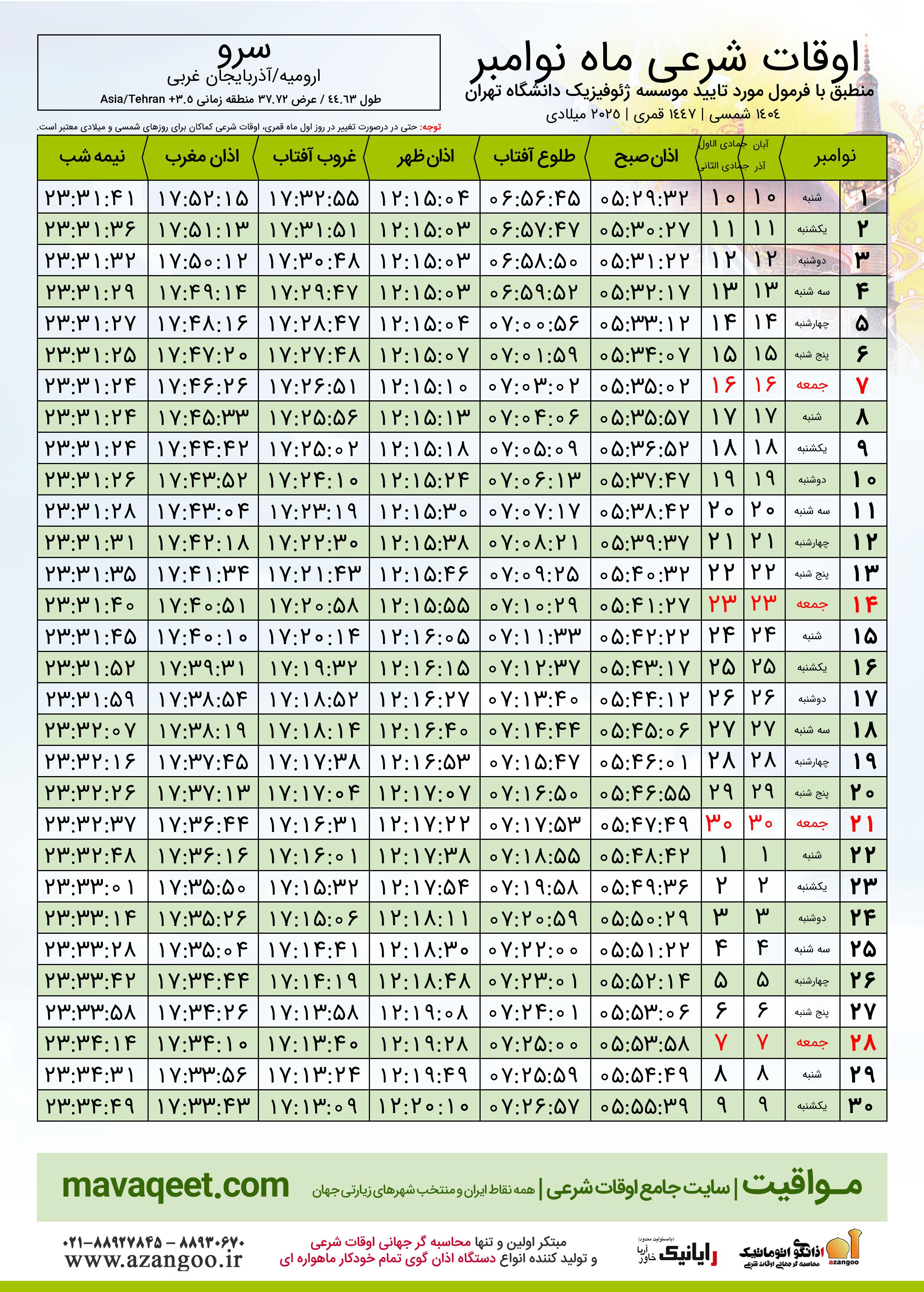 جدول اوقات شرعی نوامبر ٢٠٢٥ میلادی شهر سرو