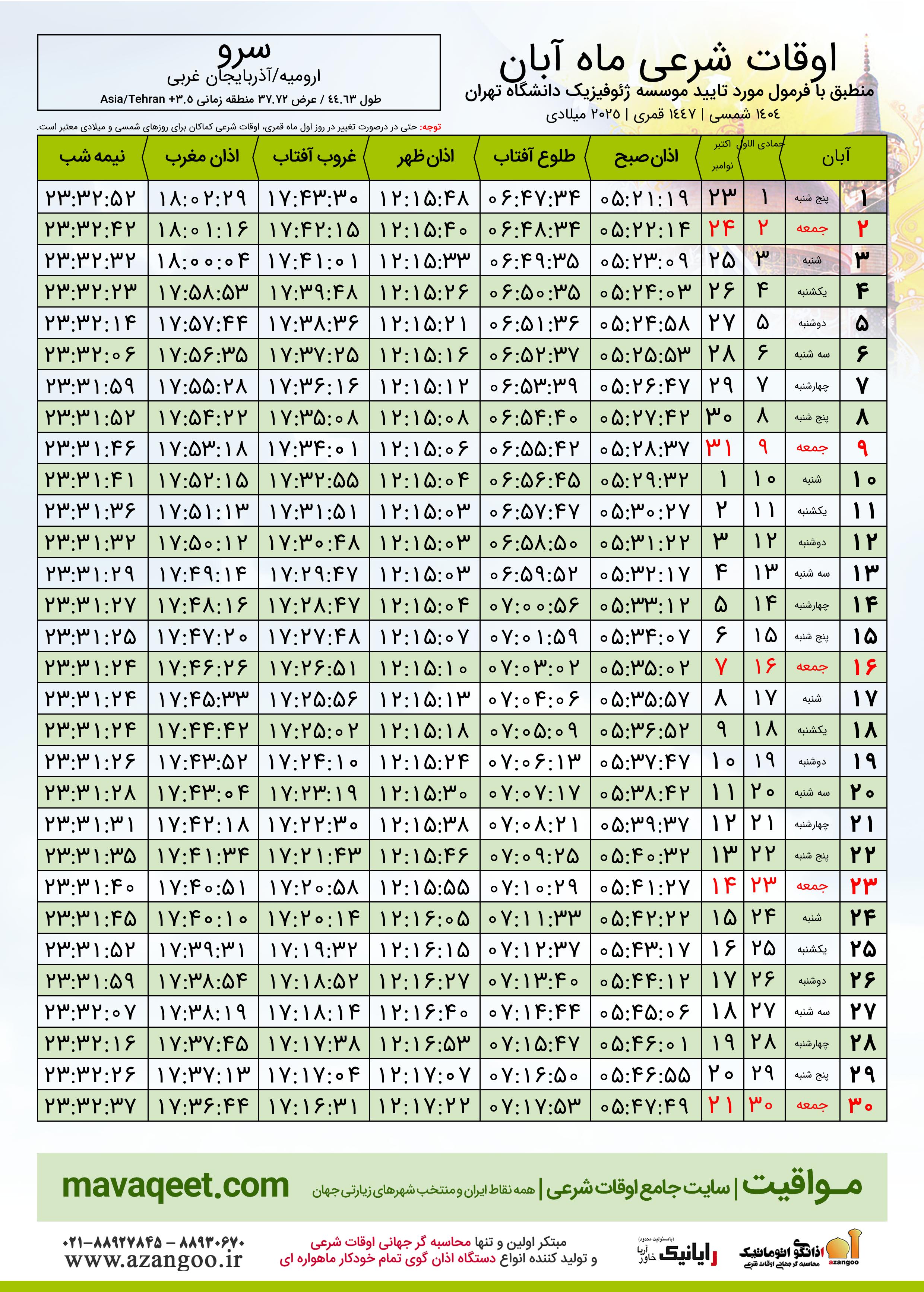اوقات شرعی آبان ١٤٠٤ شمسی شهر سرو