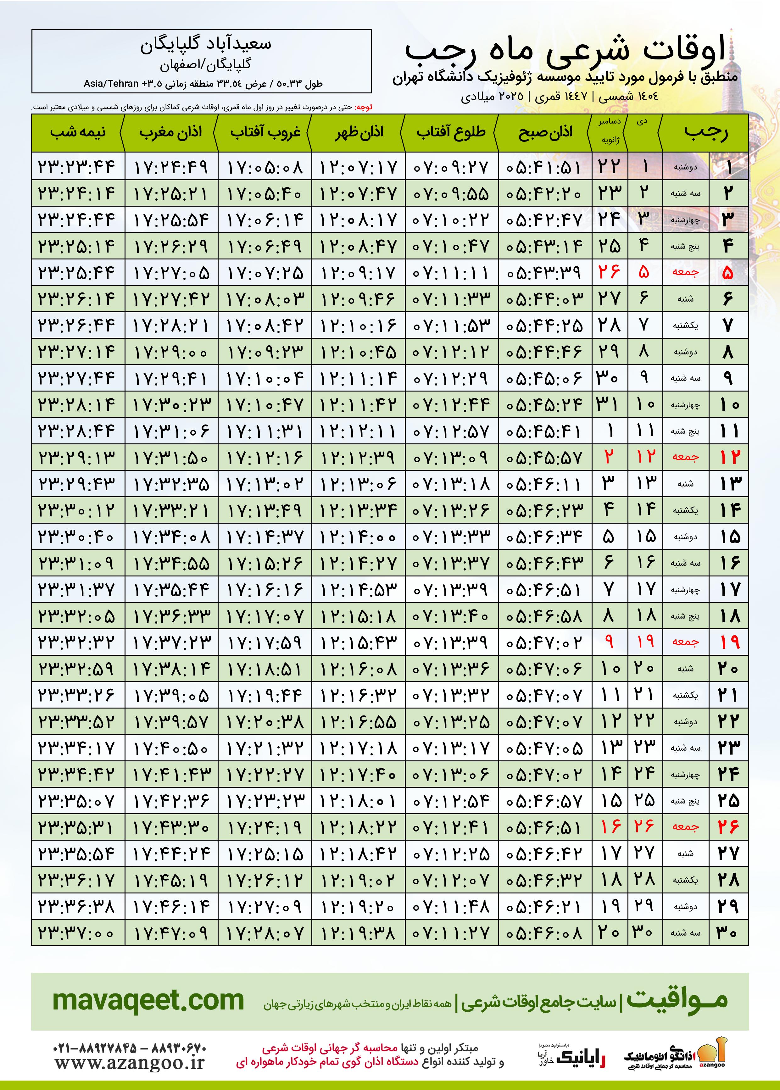 اوقات شرعی رجب ١٤٤٧ قمری شهر سعیدآباد گلپایگان
