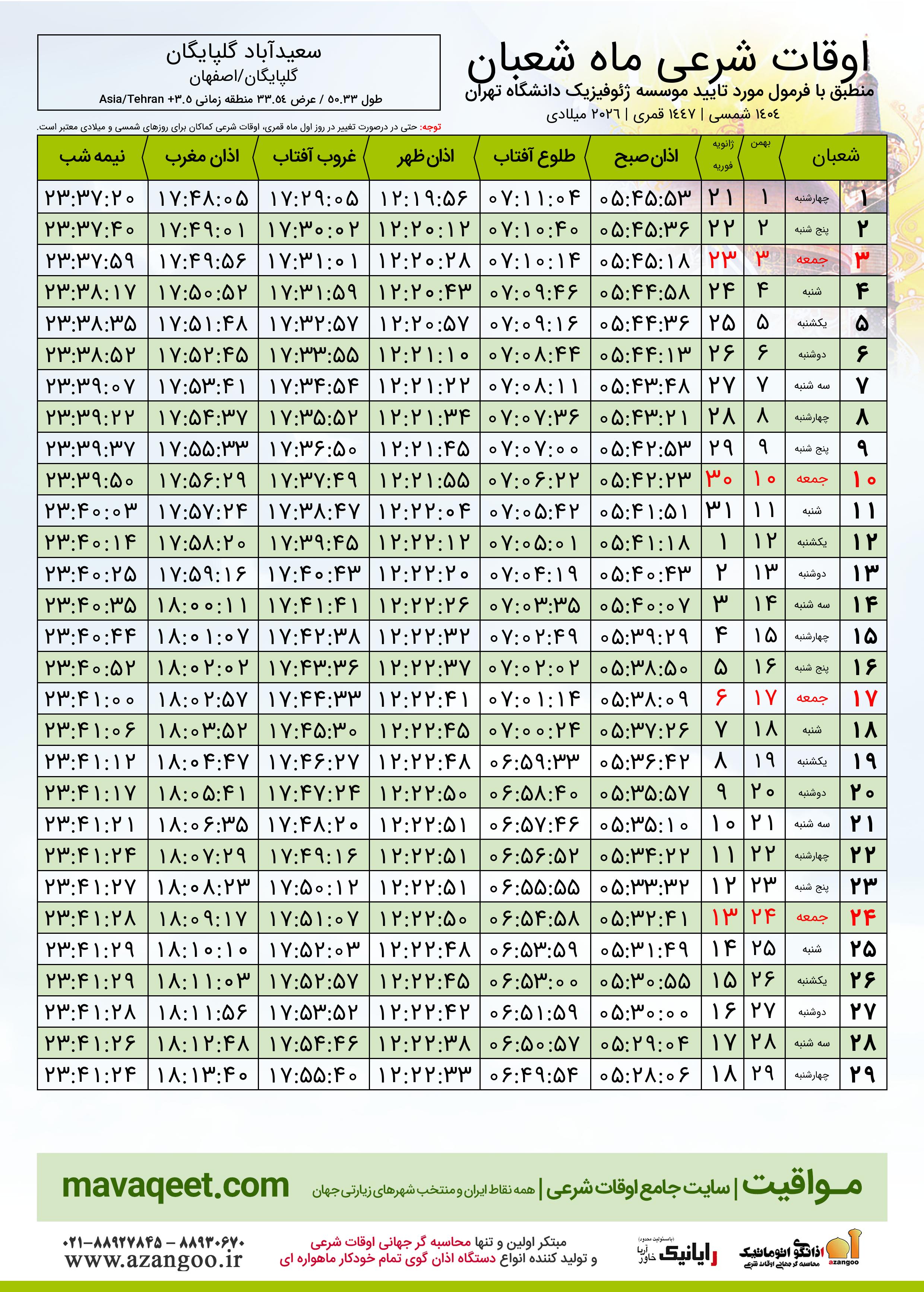 اوقات شرعی ماه شعبان ١٤٤٧ هـ.ق شهر سعیدآباد گلپایگان بر