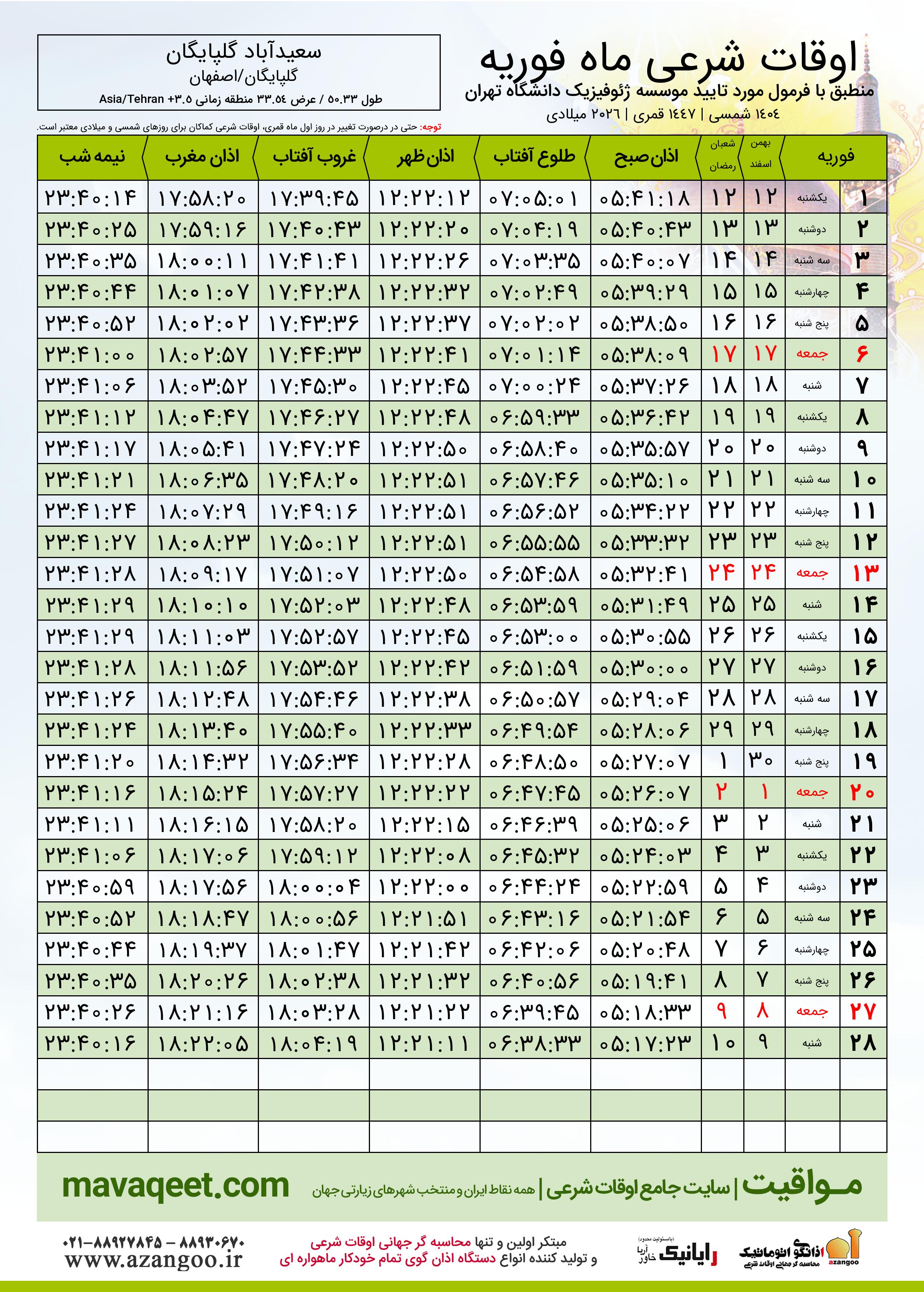 اوقات شرعی فوریه ٢٠٢٦ میلادی شهر سعیدآباد گلپایگان