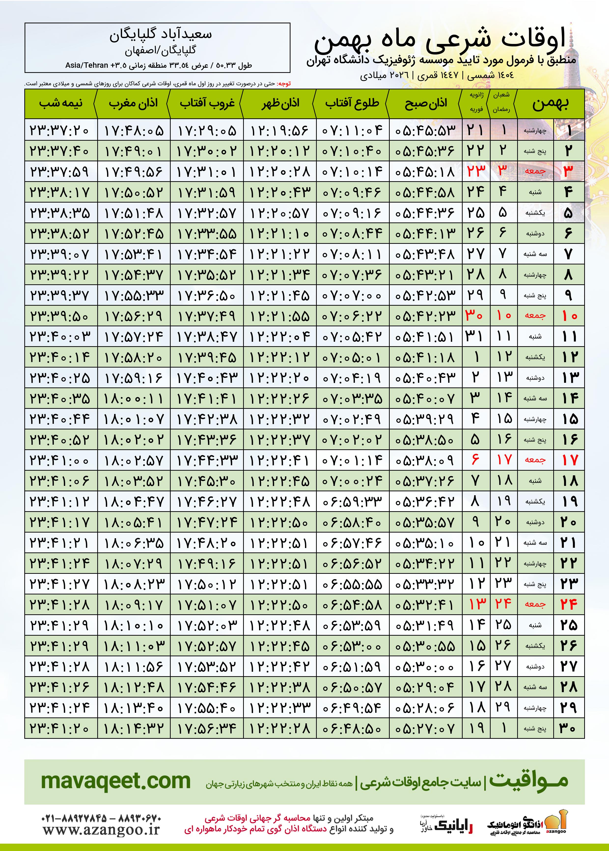 دانلود اوقات شرعی بهمن ٠٤ - ١٤٠٤ شهر سعیدآباد گلپایگان
