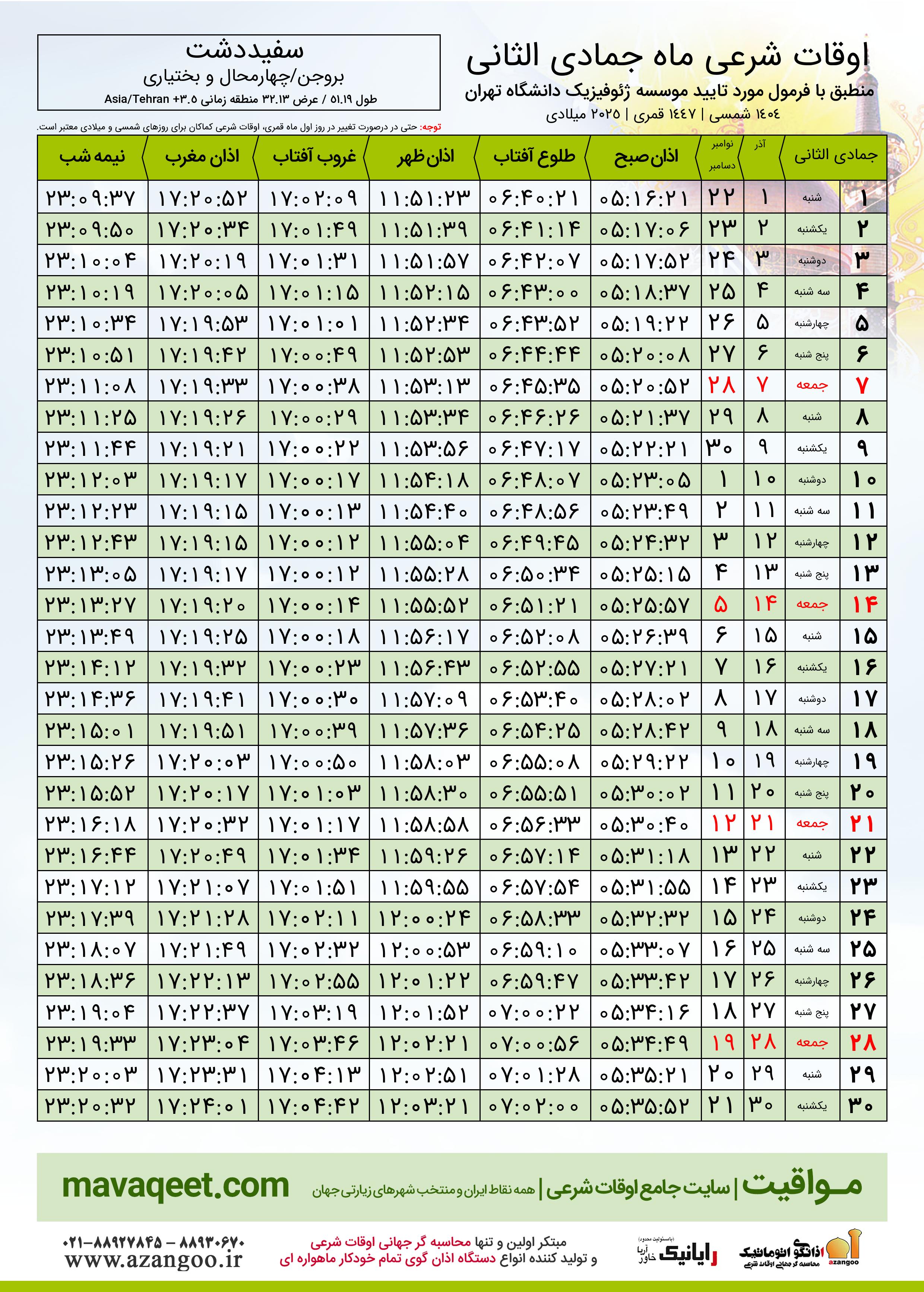 اوقات شرعی ماه جمادی الثانی ١٤٤٧ هـ.ق شهر سفیددشت بر