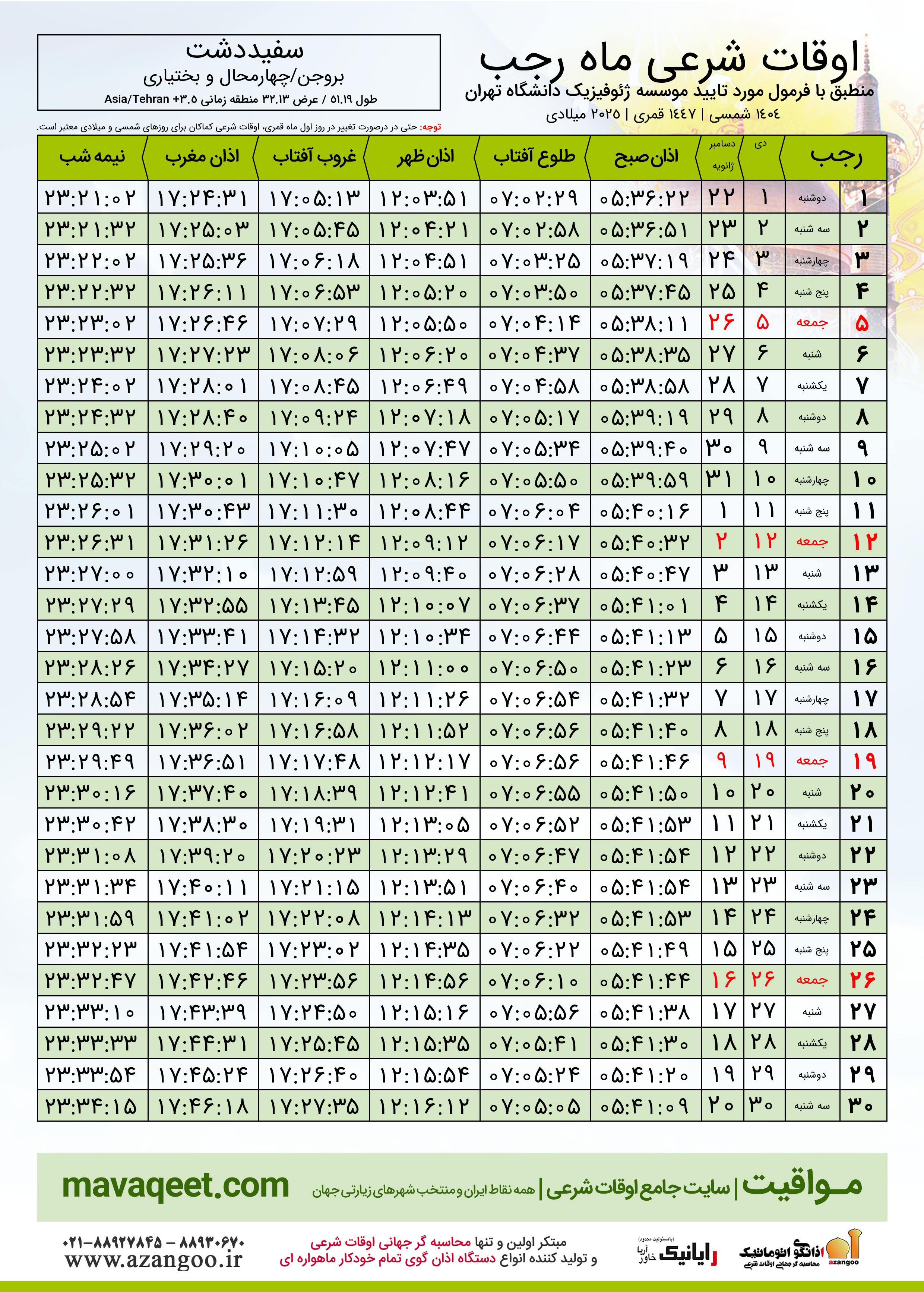 اوقات شرعی ماه رجب ١٤٤٧ هـ.ق شهر سفیددشت بر