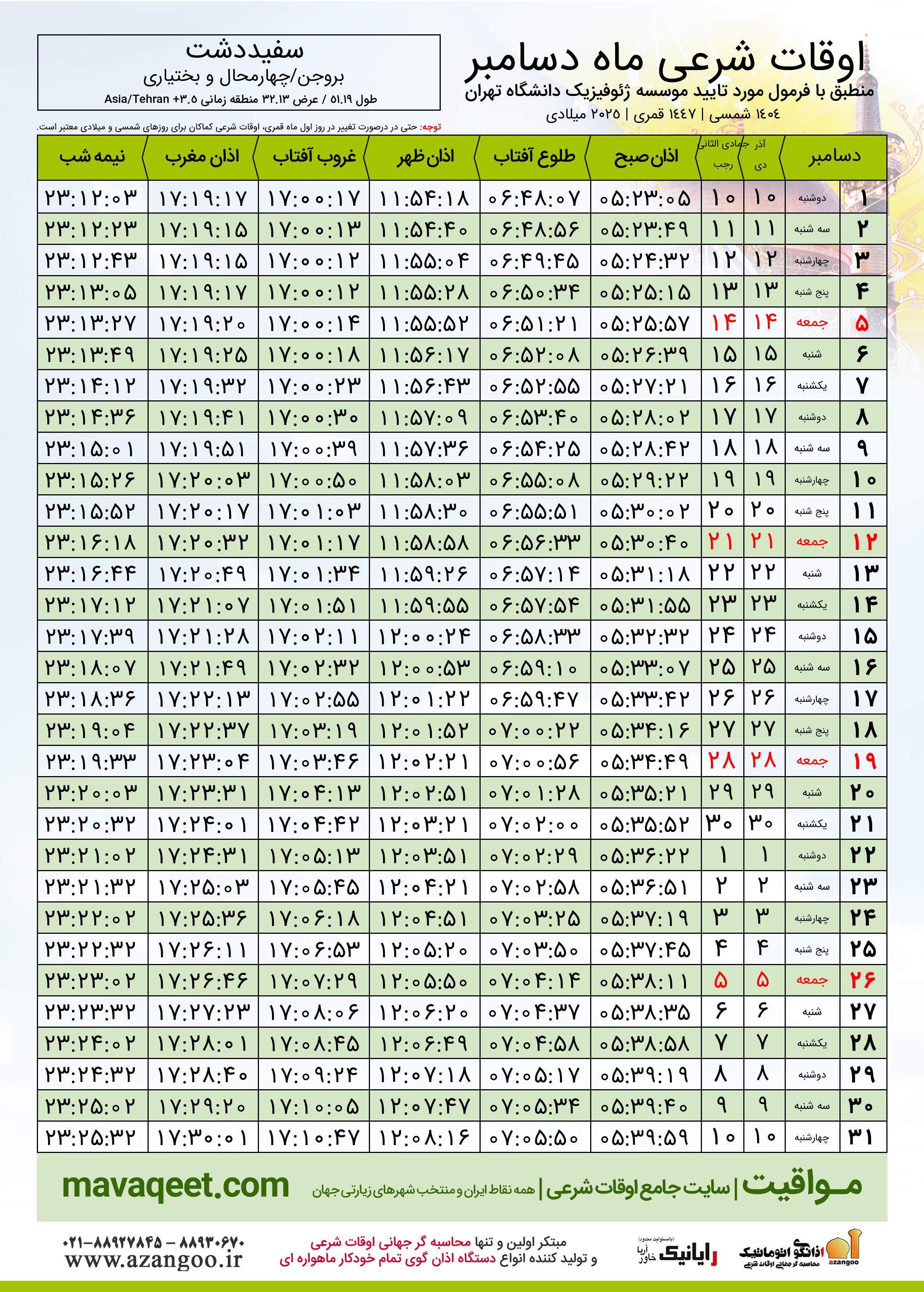 جدول اوقات شرعی دسامبر ٢٠٢٥ میلادی شهر سفیددشت