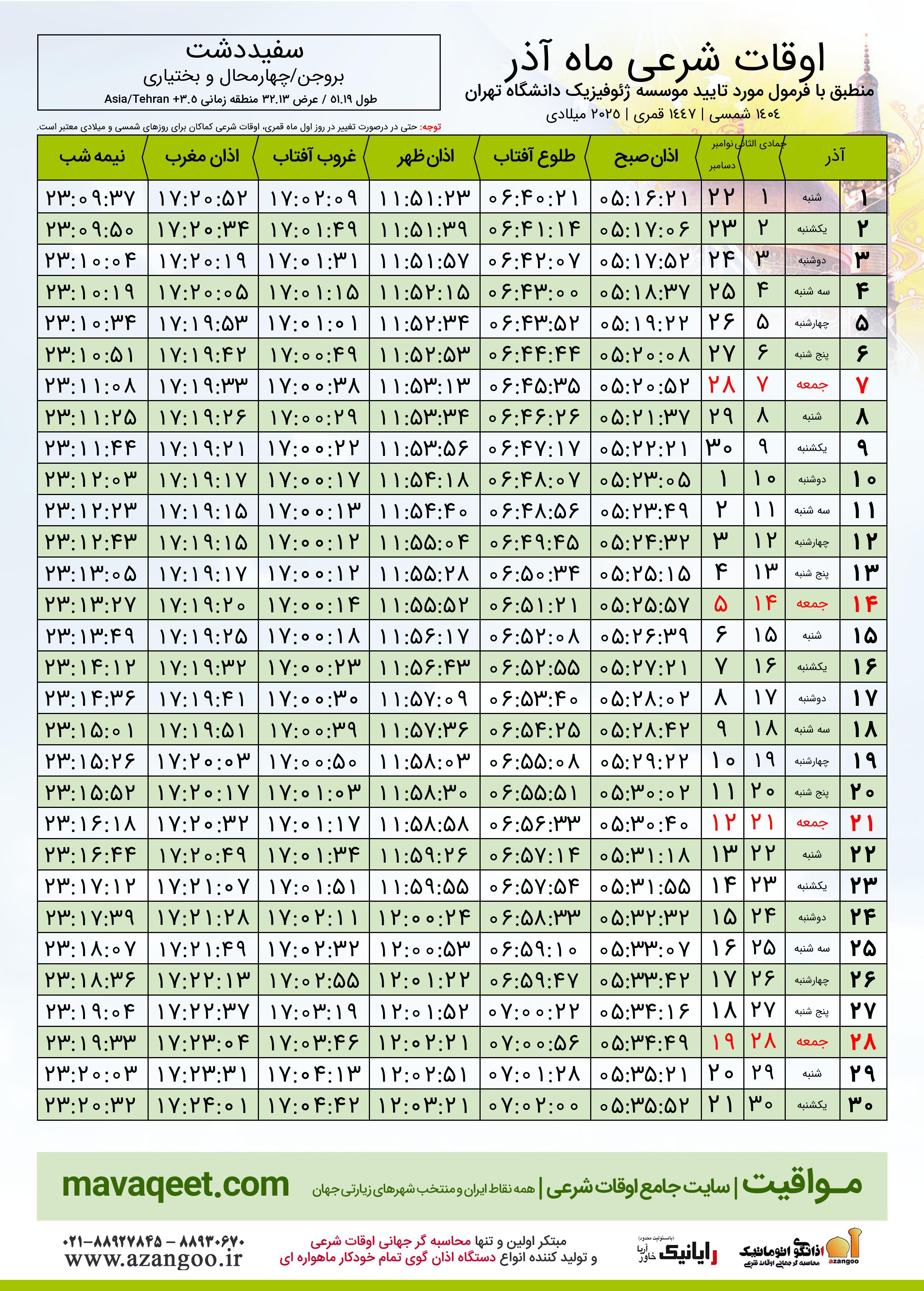 اوقات شرعی آذر ١٤٠٤ شمسی شهر سفیددشت