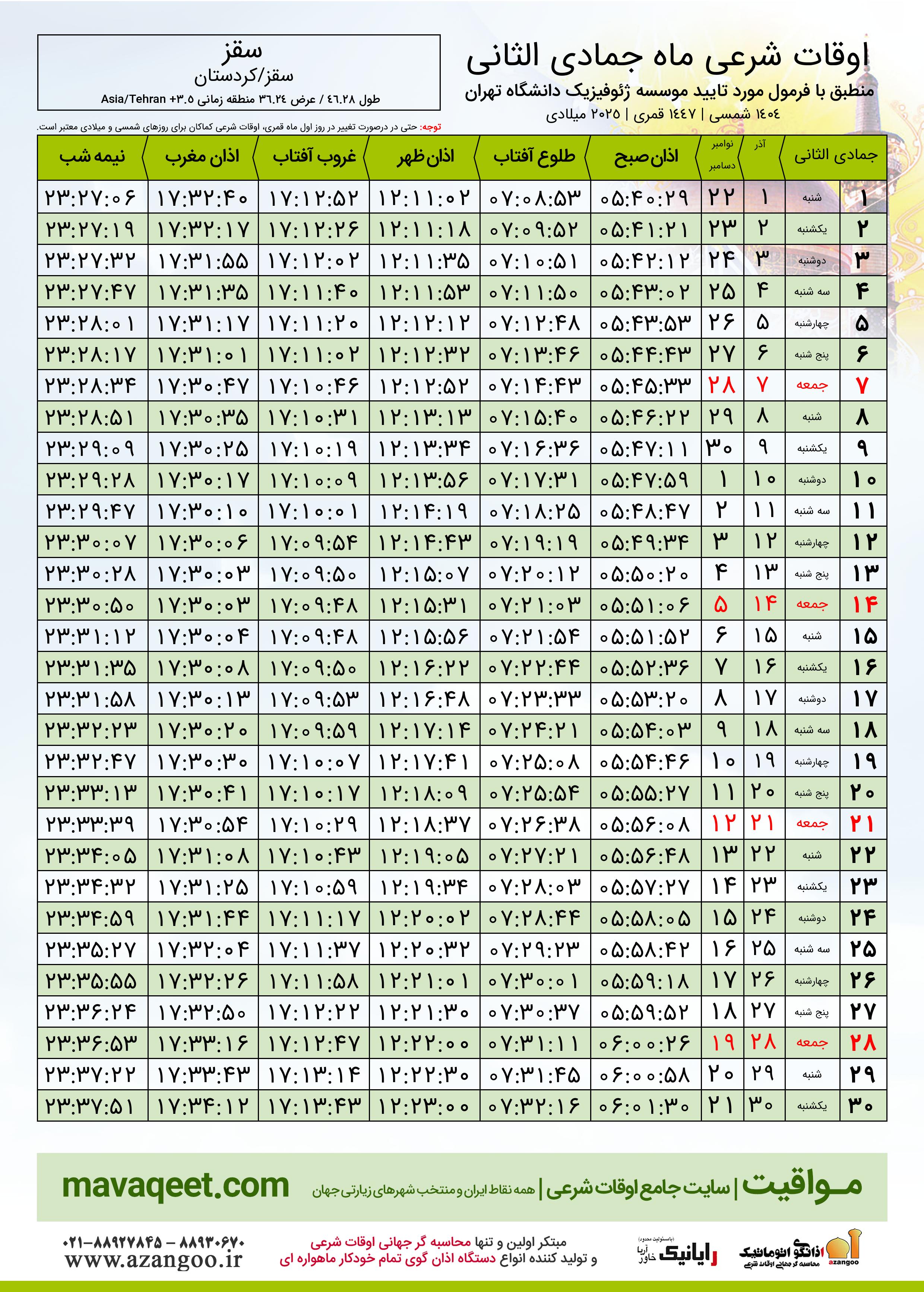 اوقات شرعی ماه جمادی الثانی ١٤٤٧ هـ.ق شهر سقز بر