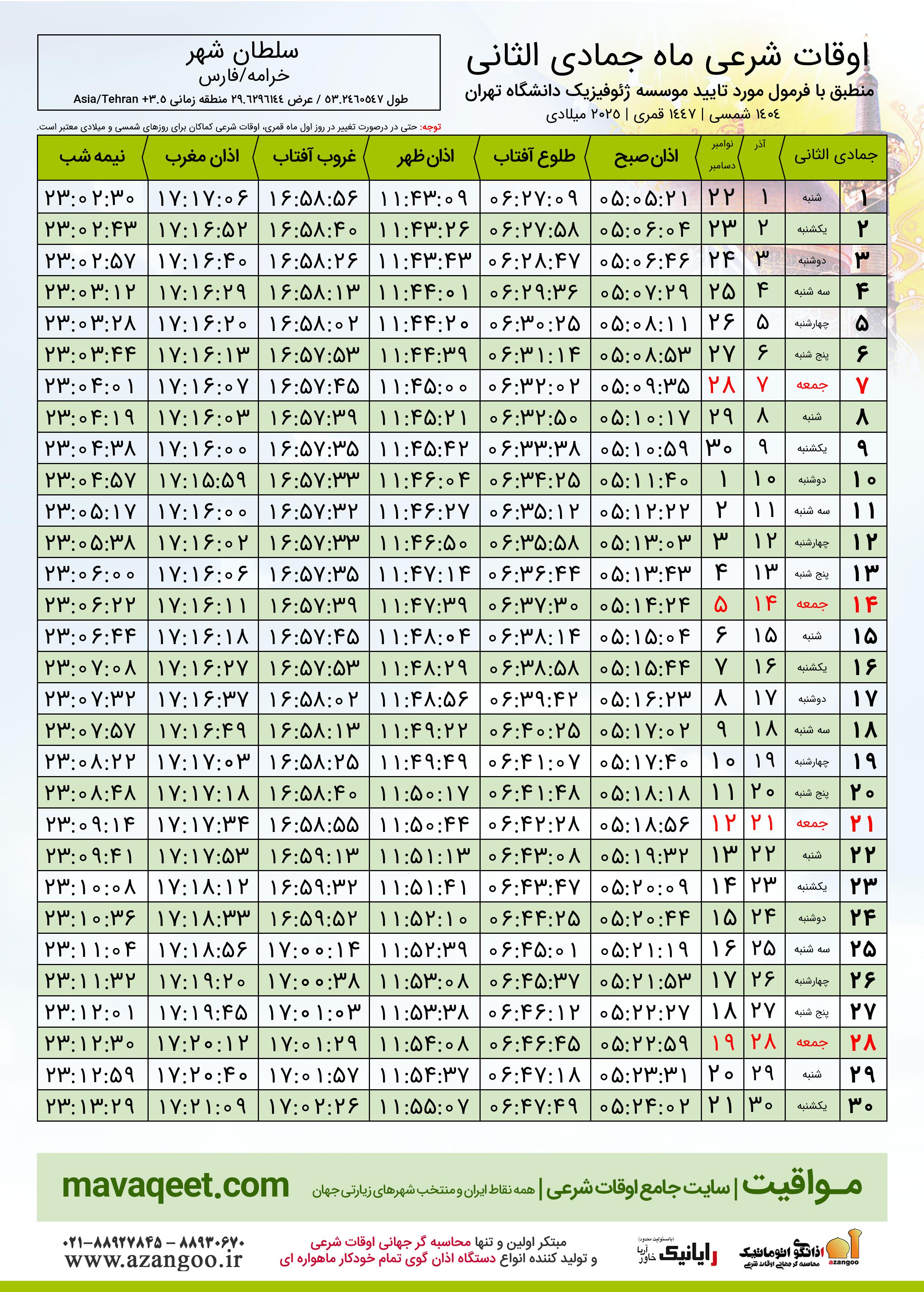 جدول اوقات شرعی جمادی الثانی ١٤٤٧ قمری شهر سلطان شهر