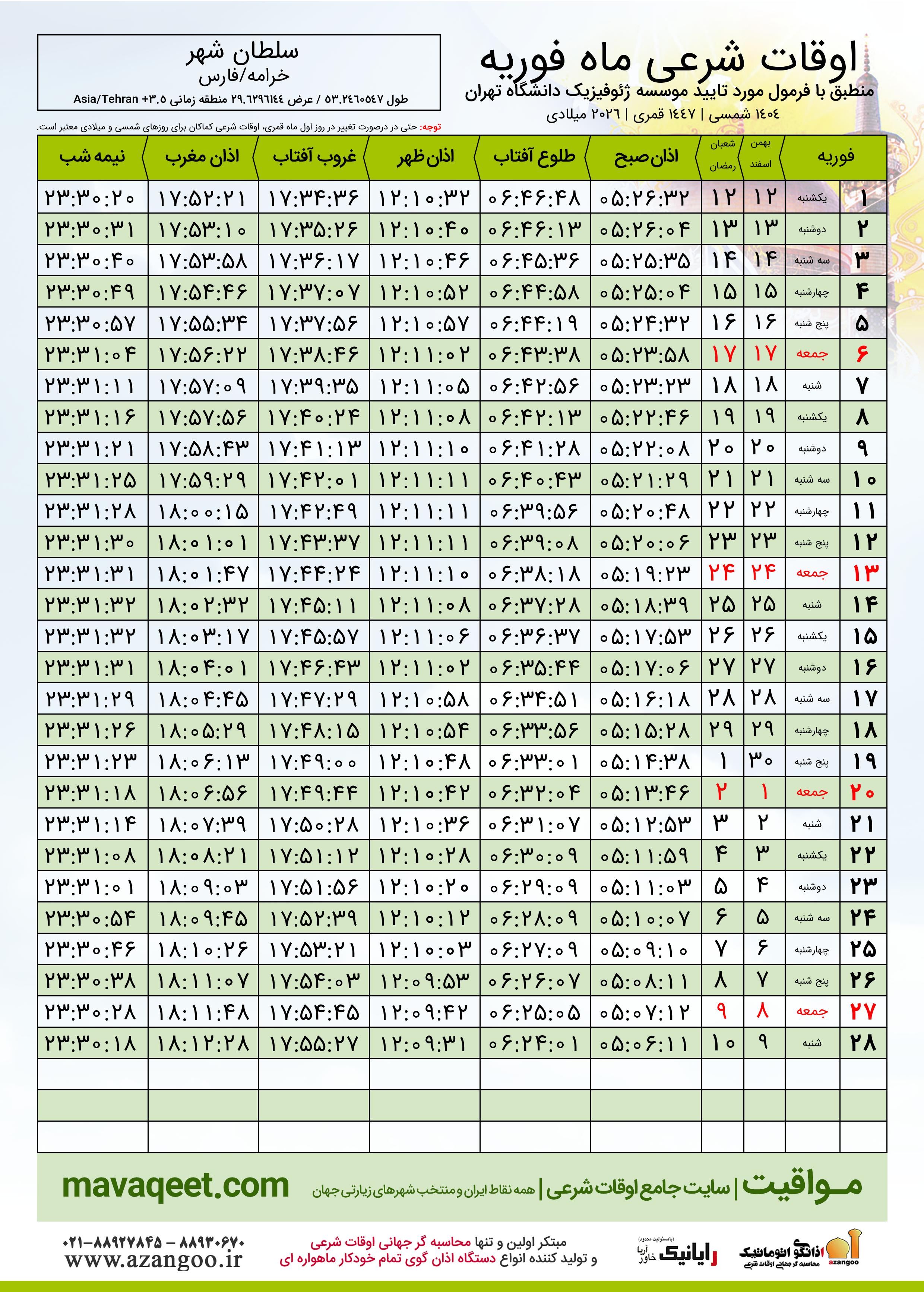 دانلود اوقات شرعی ماه رمضان ٠٤ - ١٤٠٤ شمسی | ٢٠٢٦ میلادی | ١٤٤٧ قمری شهر سلطان شهر