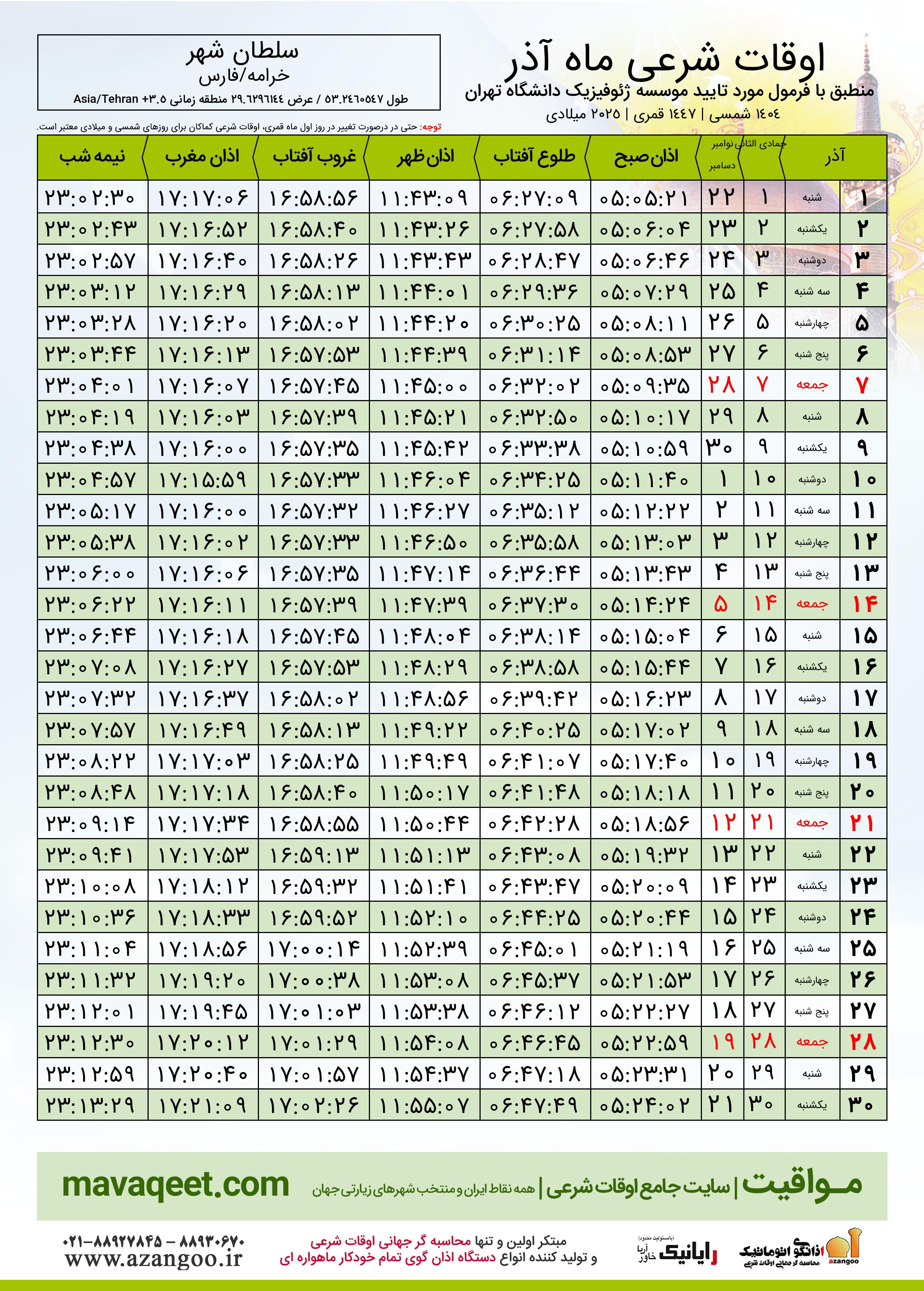 اوقات شرعی آذر ١٤٠٤ شمسی شهر سلطان شهر