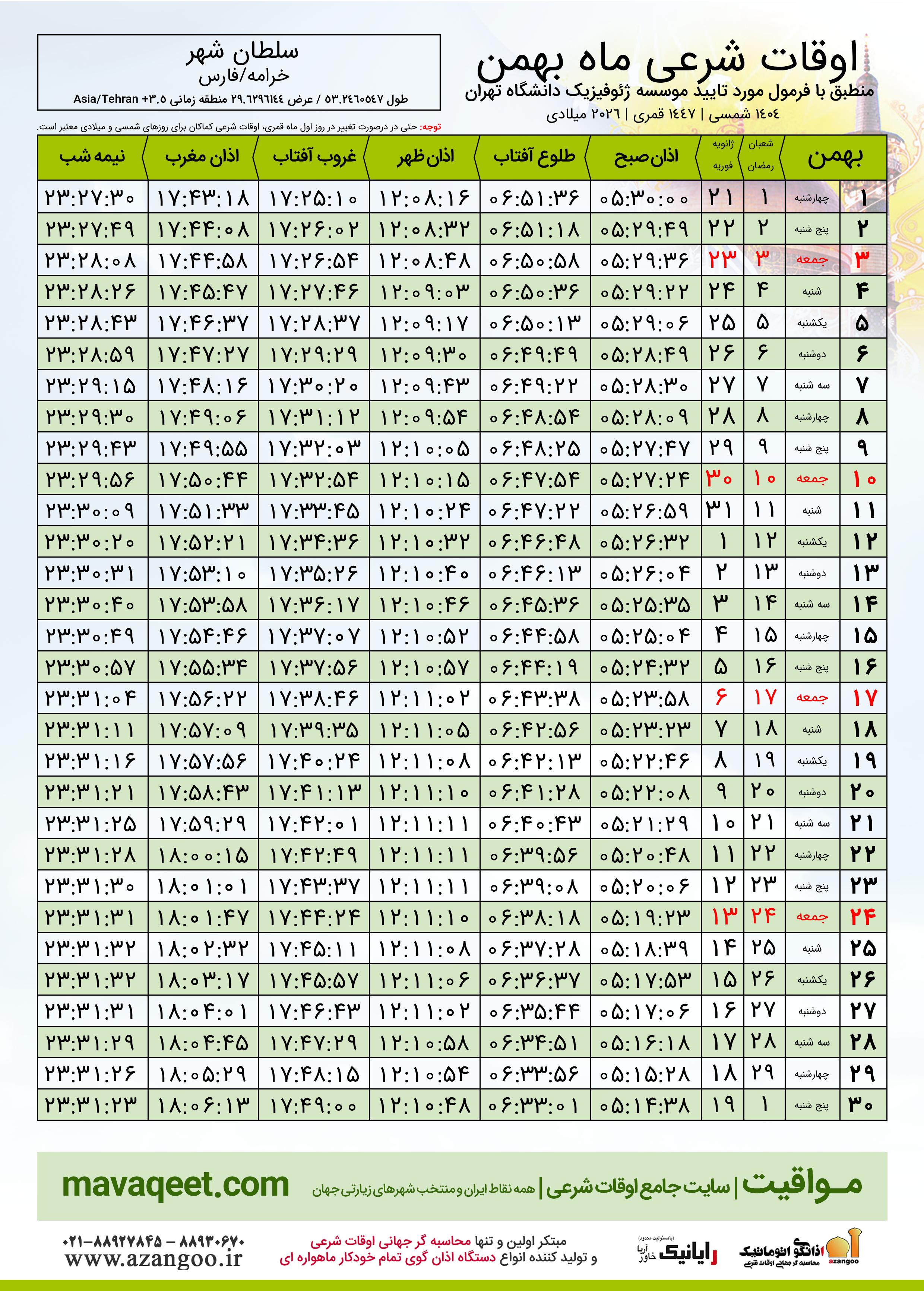 اوقات شرعی بهمن ٠٤ شهر سلطان شهر + دانلود