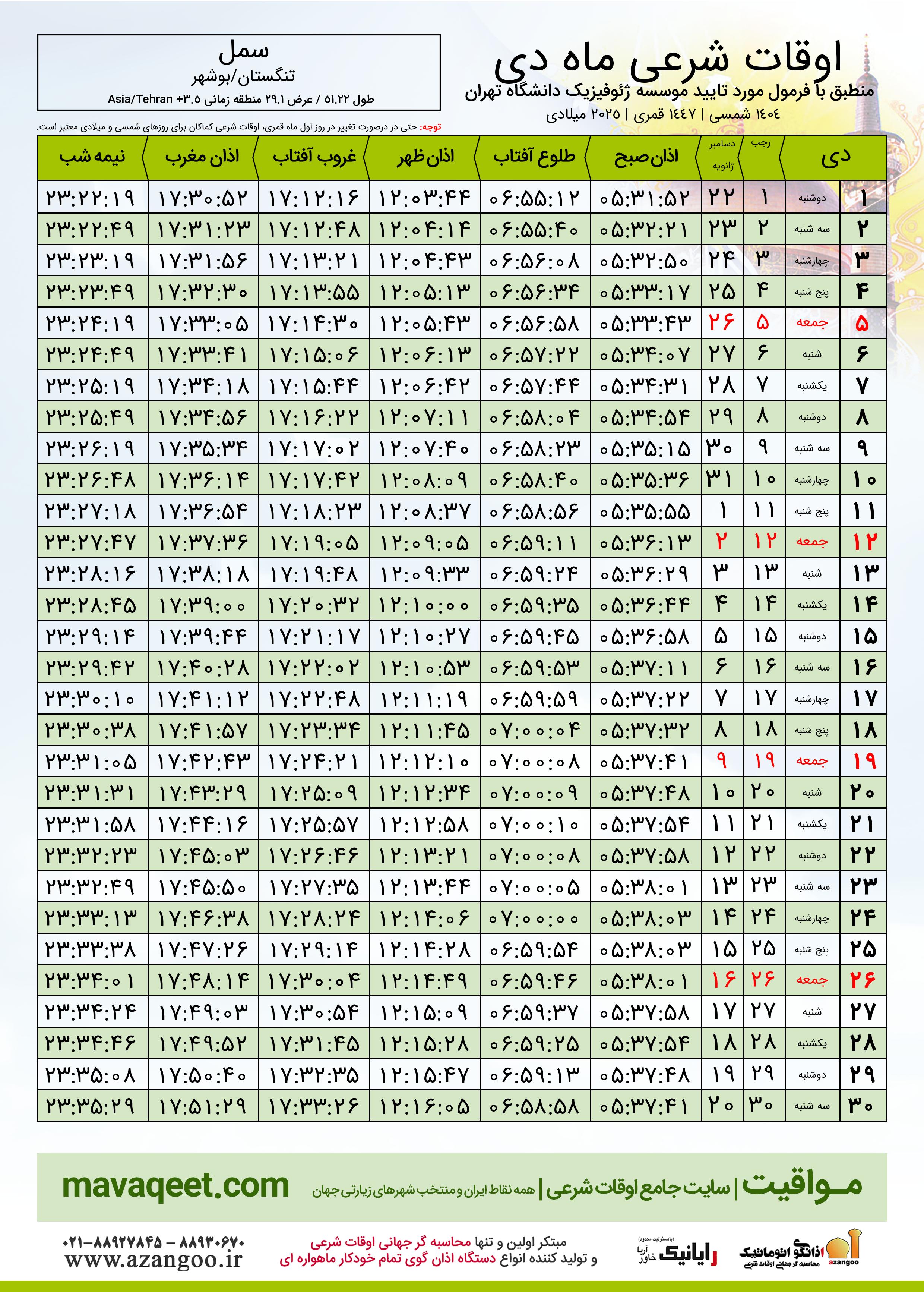 اوقات شرعی دی ١٤٠٤ شمسی شهر سمل