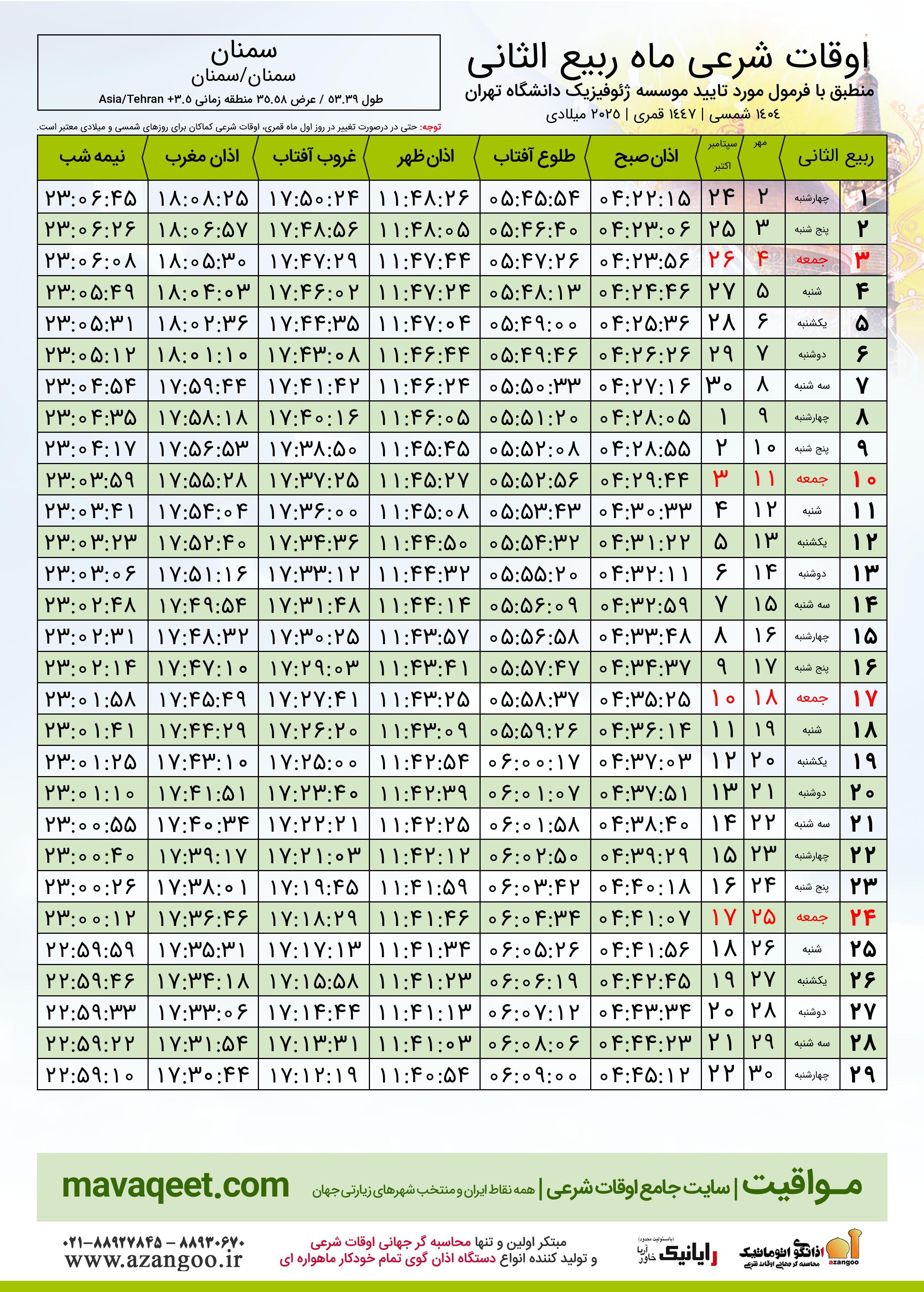اوقات شرعی ماه ربیع الثانی ١٤٤٧ هـ.ق شهر سمنان بر