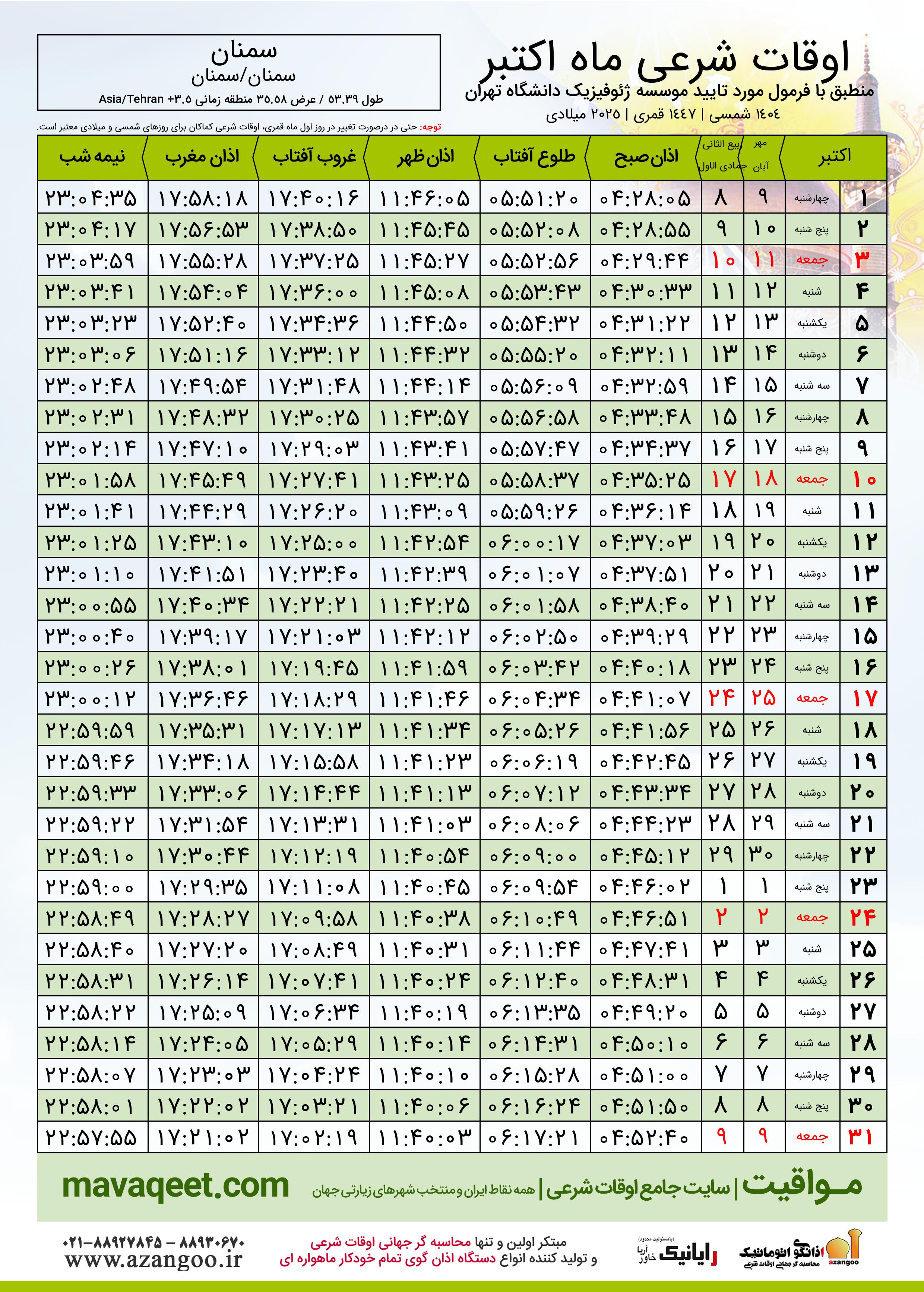 جدول اوقات شرعی اکتبر ٢٠٢٥ میلادی شهر سمنان