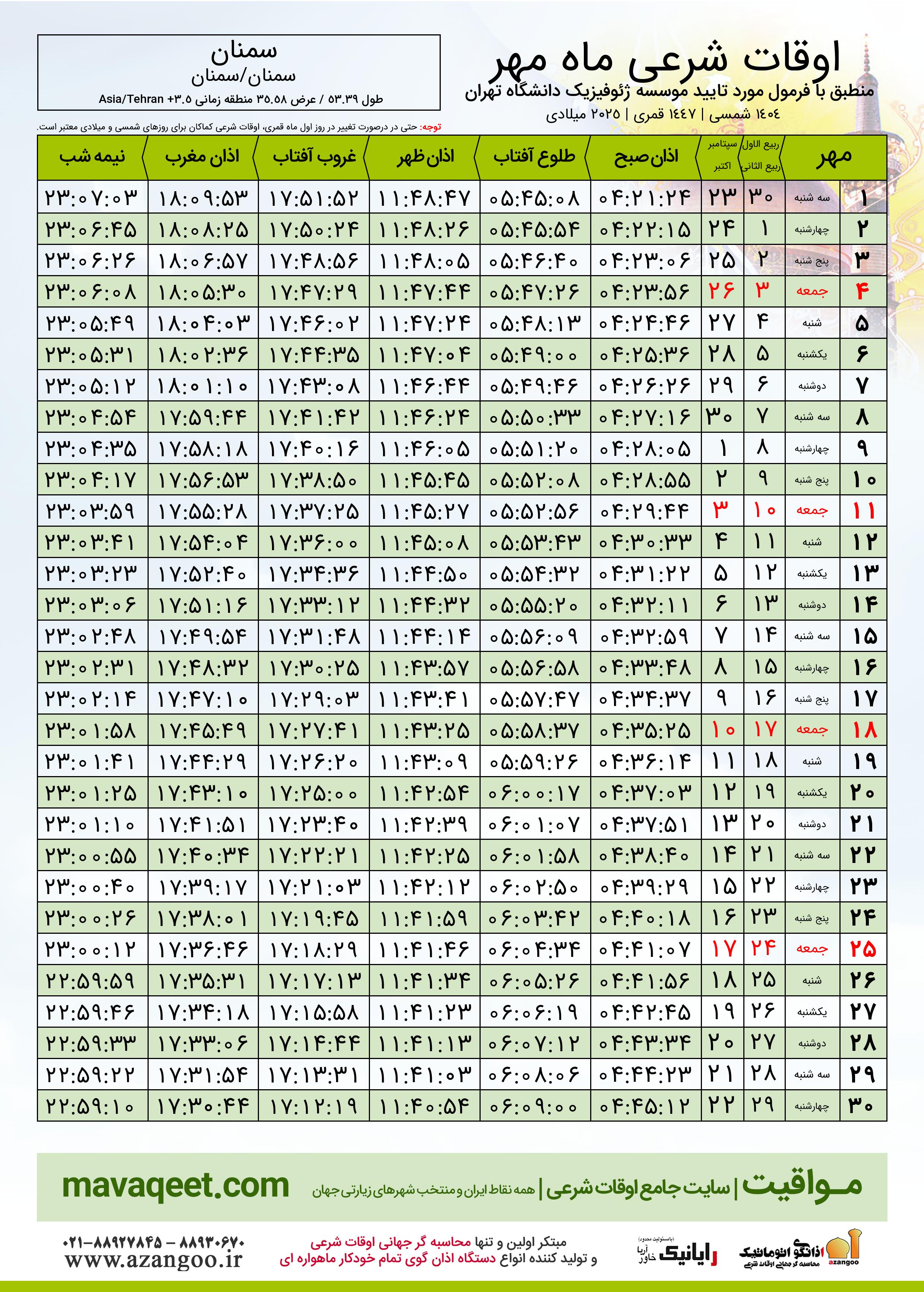 جدول اوقات شرعی مهر ١٤٠٤ شمسی شهر سمنان