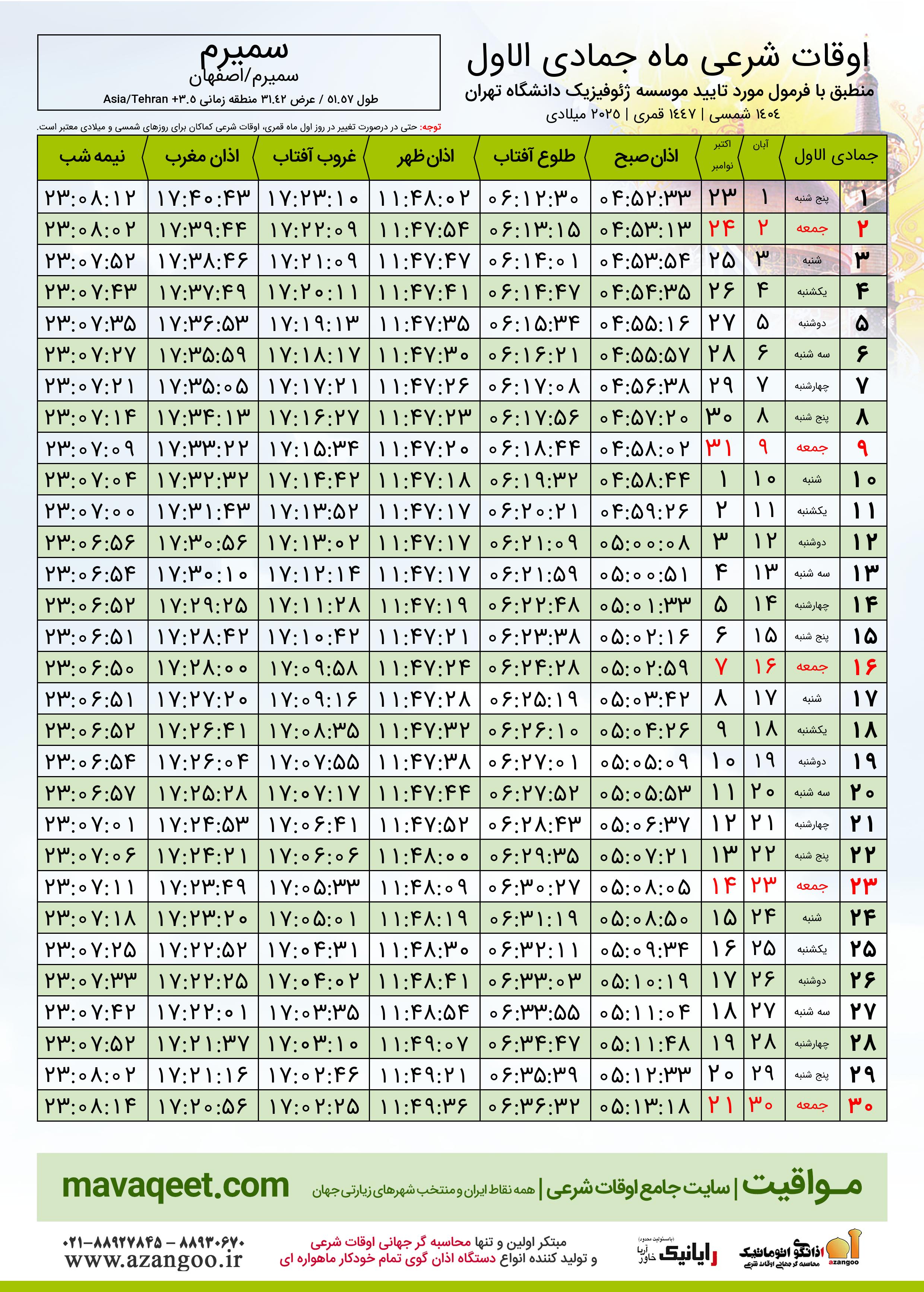 جدول اوقات شرعی جمادی الاول ١٤٤٧ قمری شهر سمیرم