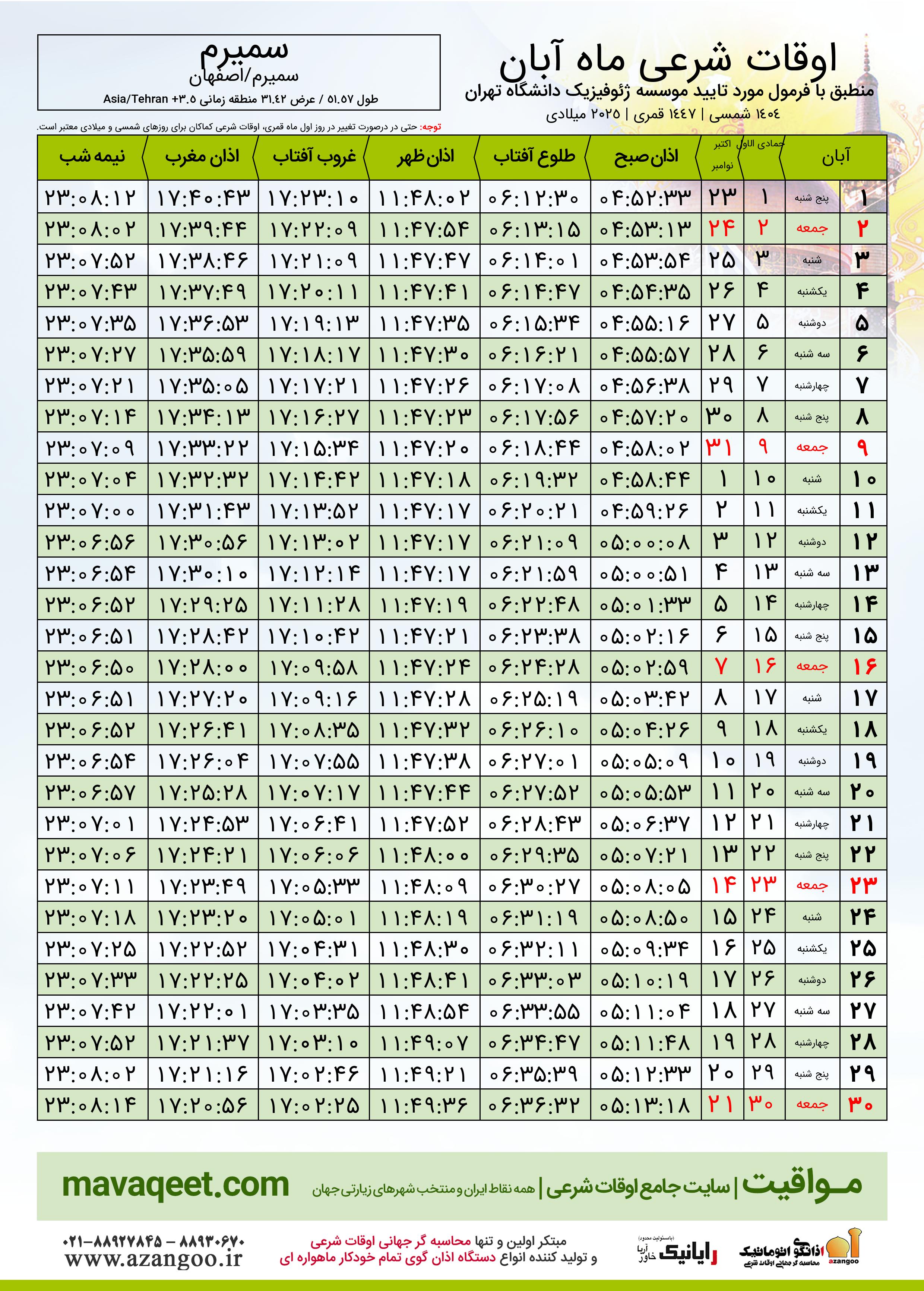 جدول اوقات شرعی آبان ١٤٠٤ شمسی شهر سمیرم