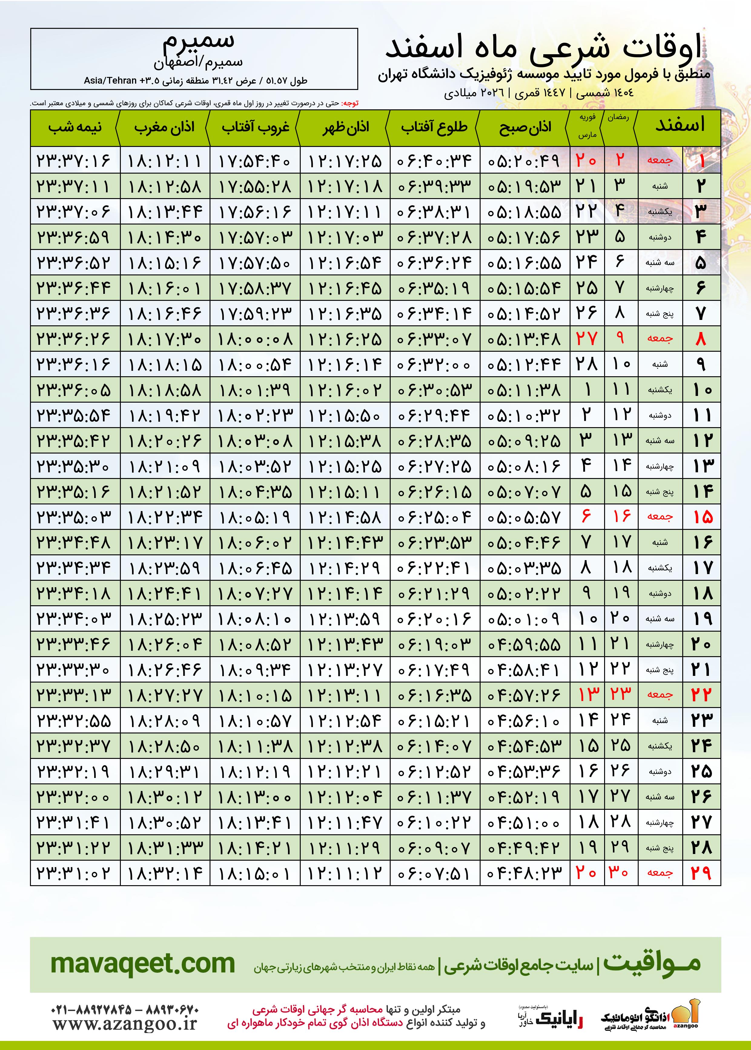 جدول اوقات شرعی اسفند ١٤٠٤ شمسی شهر سمیرم