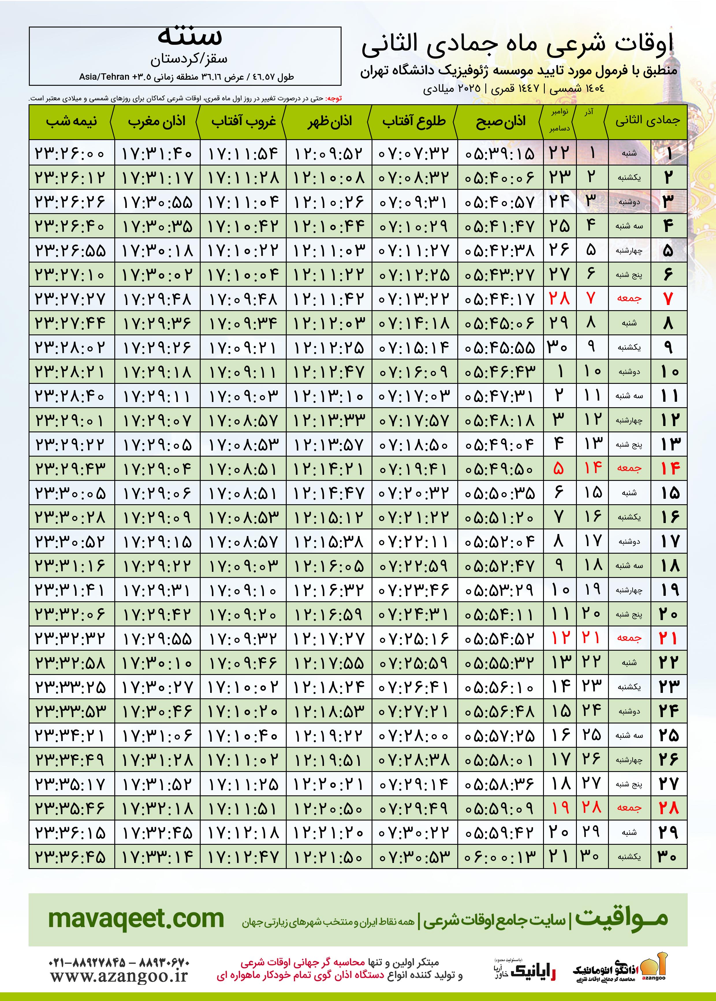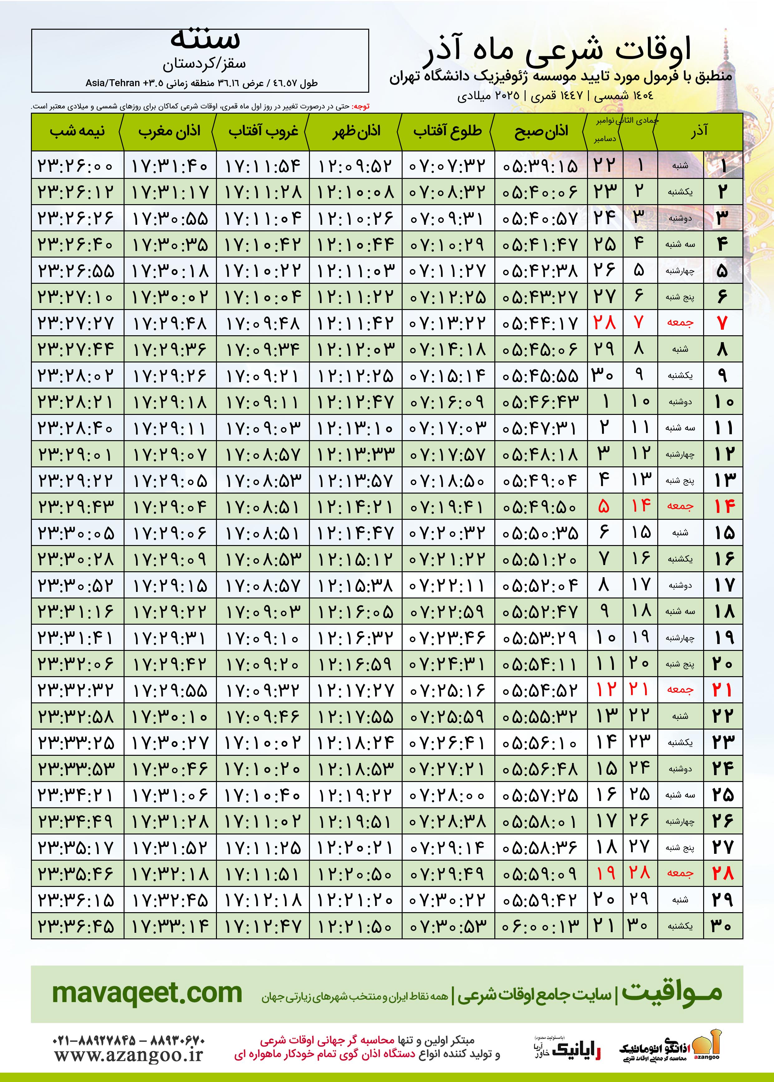 جهت نمایش تصویر جدول اوقات شرعی جدول اوقات شرعی آذر ١٤٠٤ شمسی شهر سنته شهر سنته در اندازه