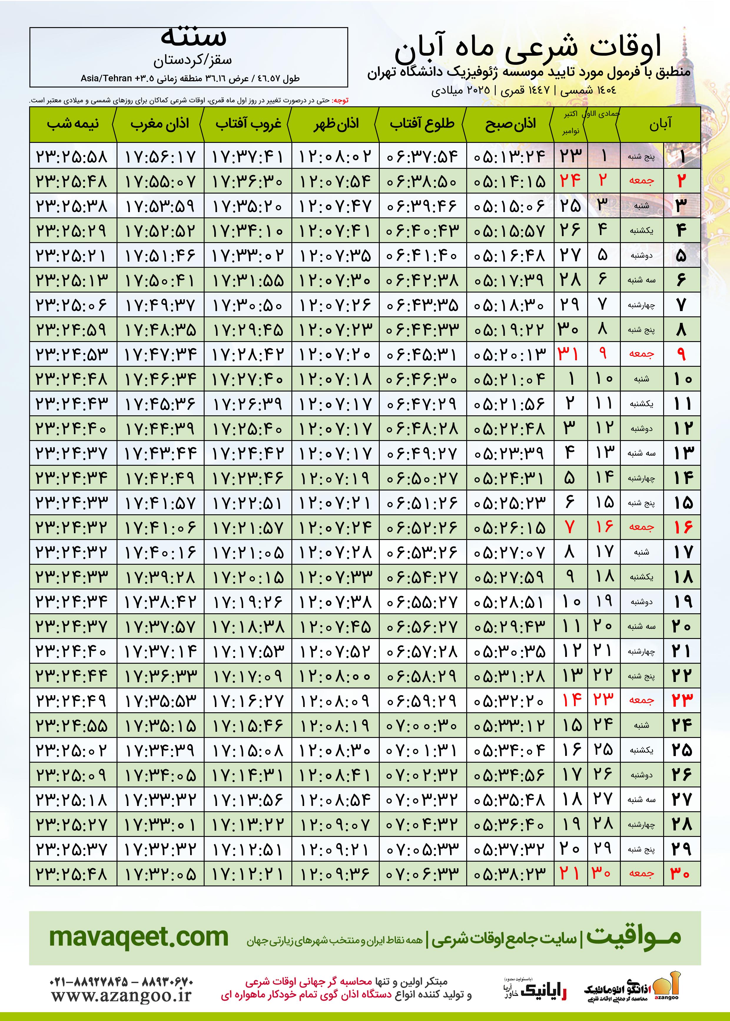 جهت نمایش تصویر جدول اوقات شرعی جدول اوقات شرعی آبان ١٤٠٤ شمسی شهر سنته شهر سنته در اندازه