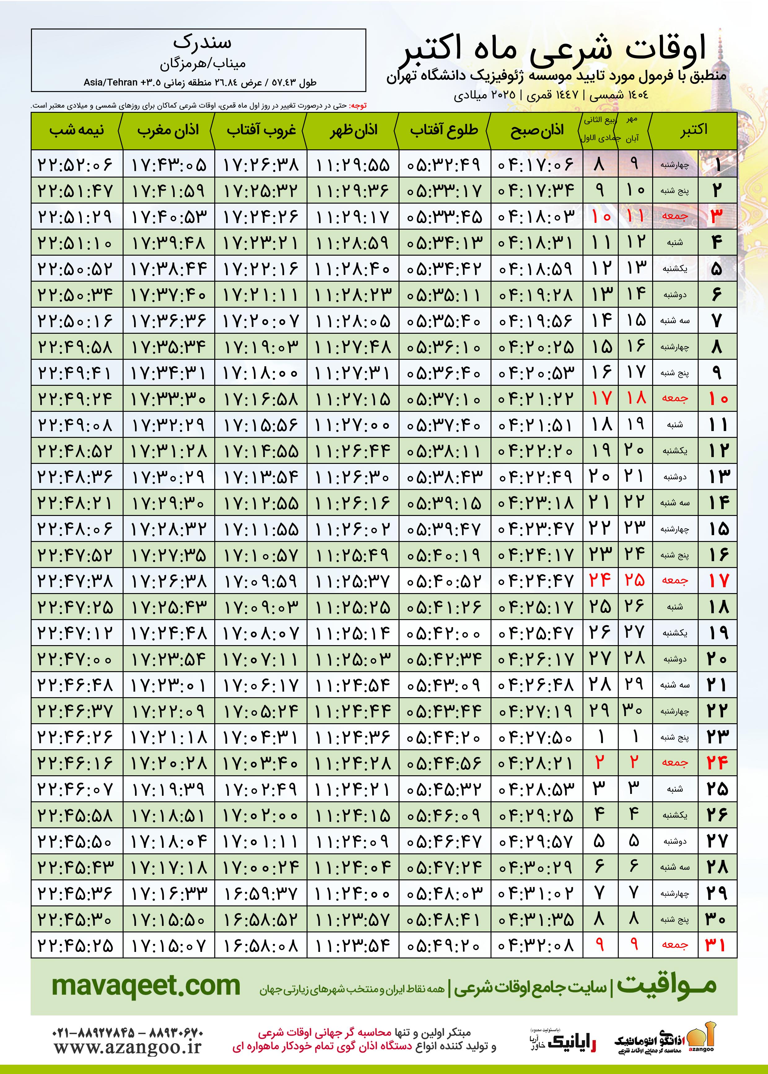 جدول اوقات شرعی اکتبر ٢٠٢٥ میلادی شهر سندرک