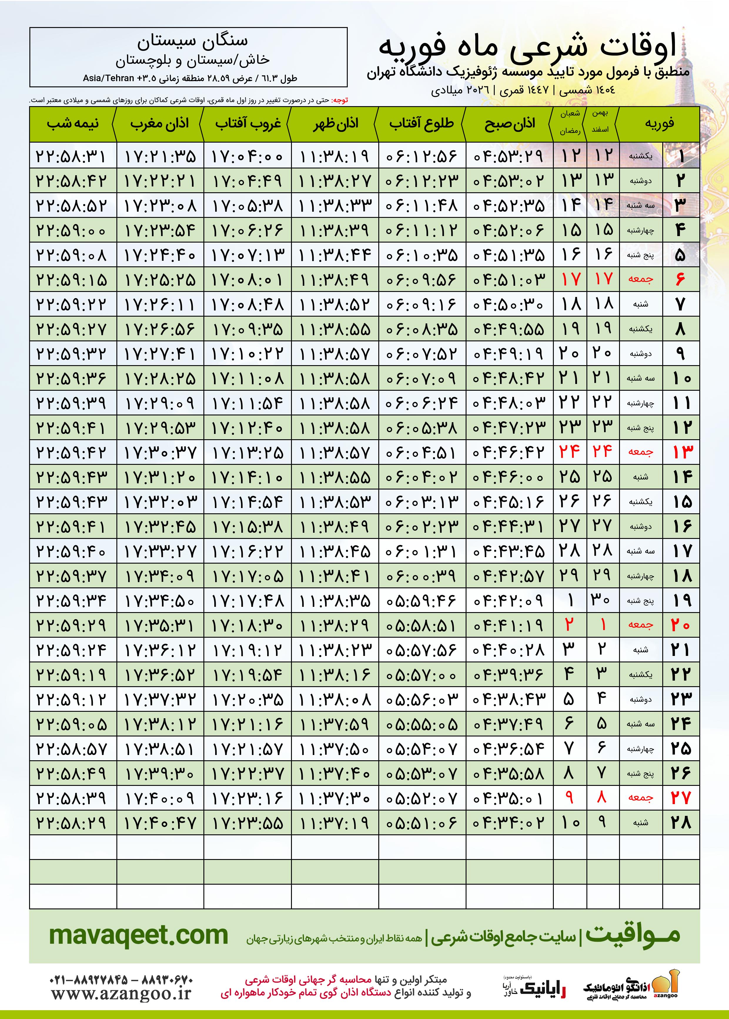 دانلود اوقات شرعی ماه رمضان ٠٤ - ١٤٠٤ شمسی | ٢٠٢٦ میلادی | ١٤٤٧ قمری شهر سنگان سیستان