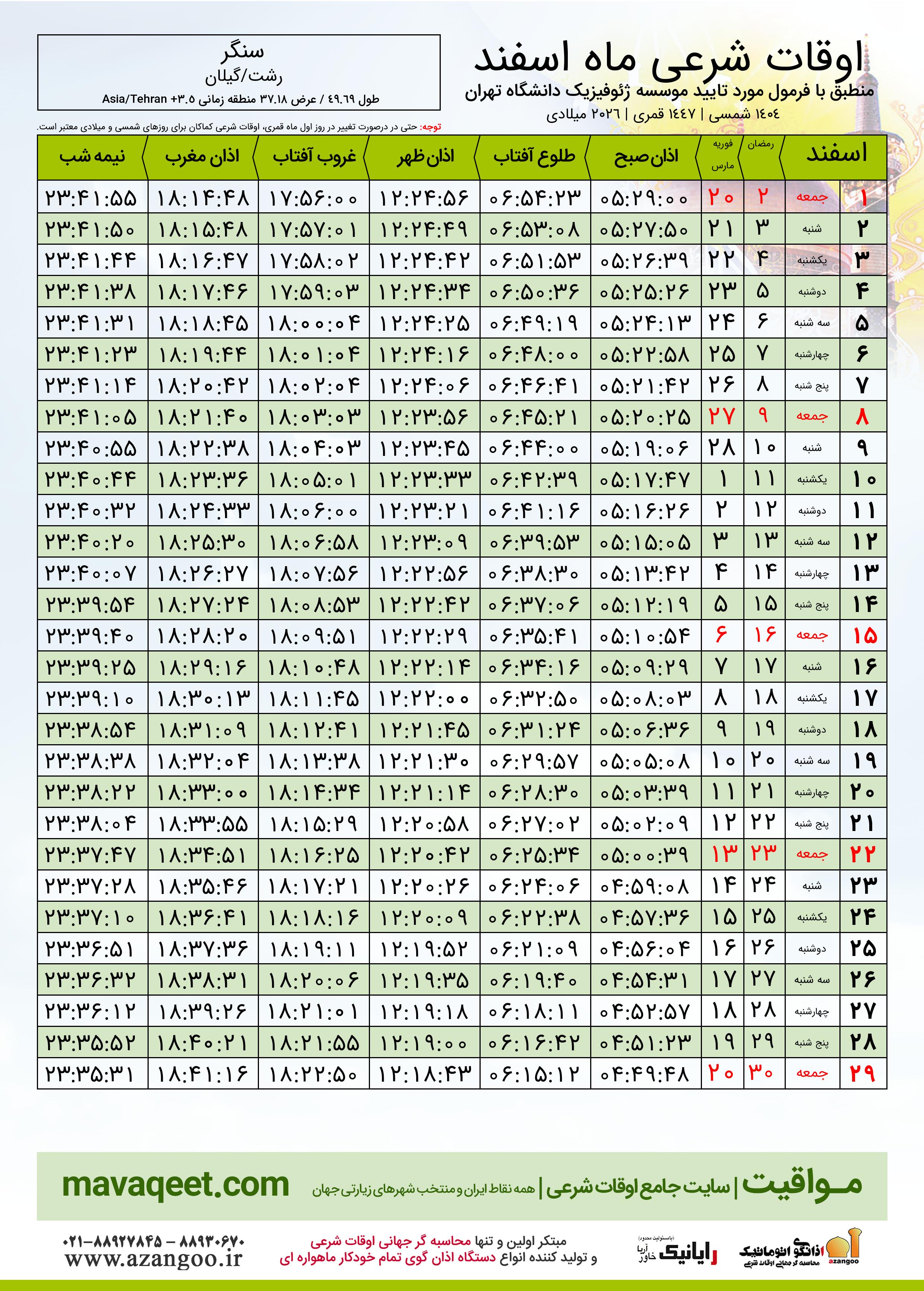 جدول اوقات شرعی اسفند ١٤٠٤ شمسی شهر سنگر