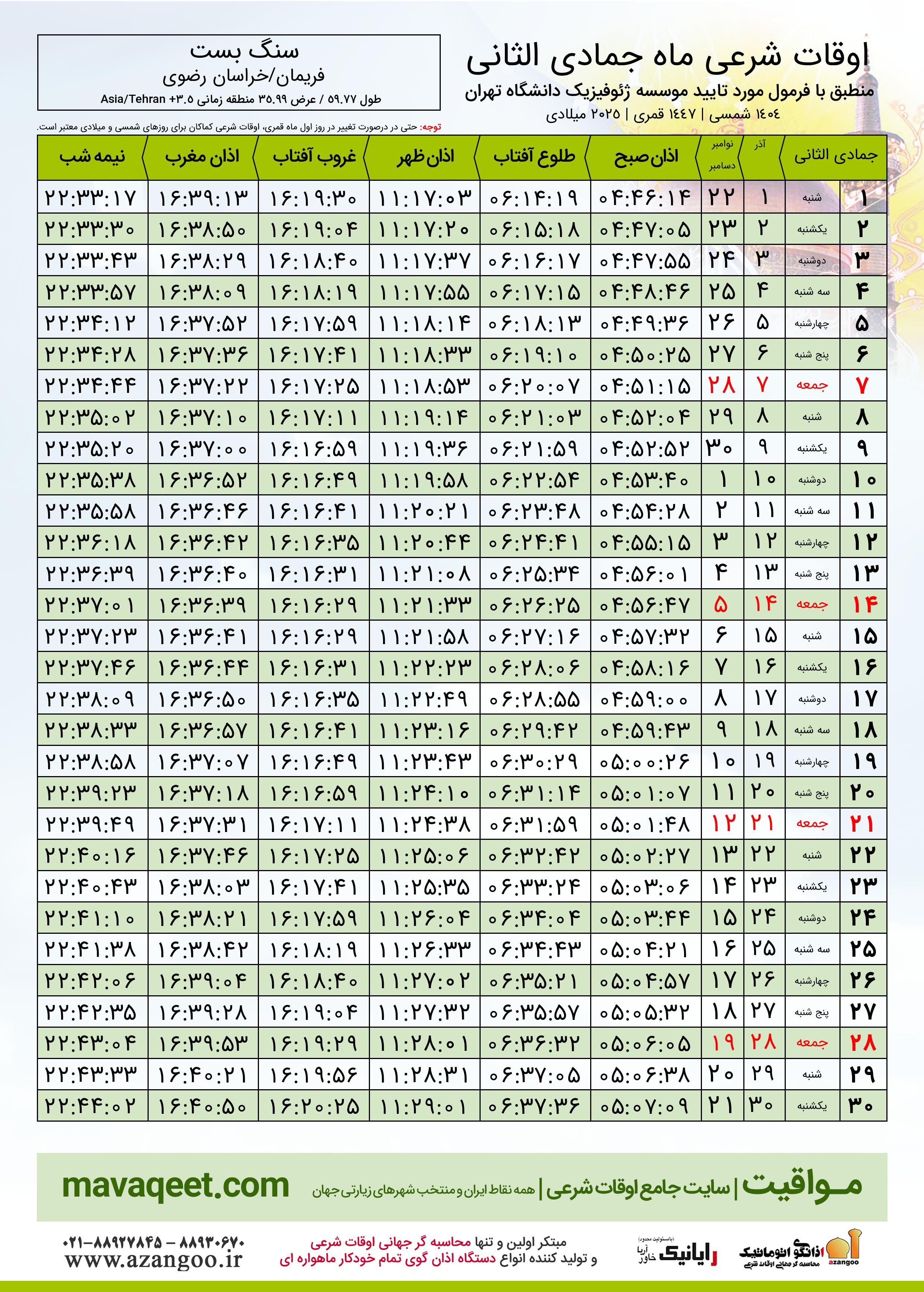 جدول اوقات شرعی جمادی الثانی ١٤٤٧ قمری شهر سنگ بست