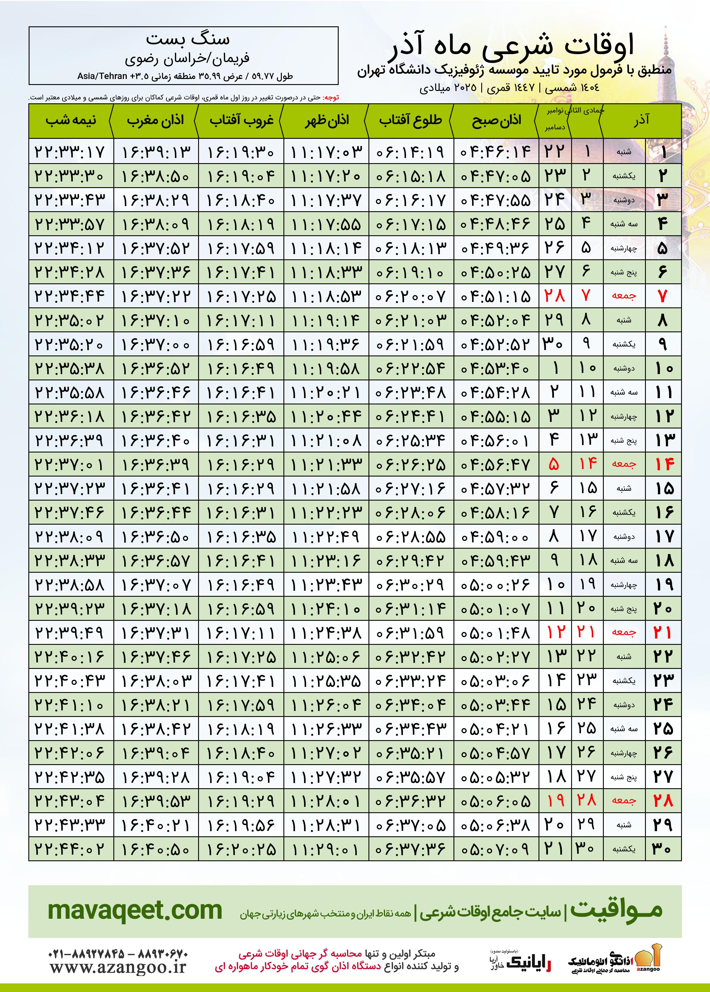 جدول اوقات شرعی آذر ١٤٠٤ شمسی شهر سنگ بست