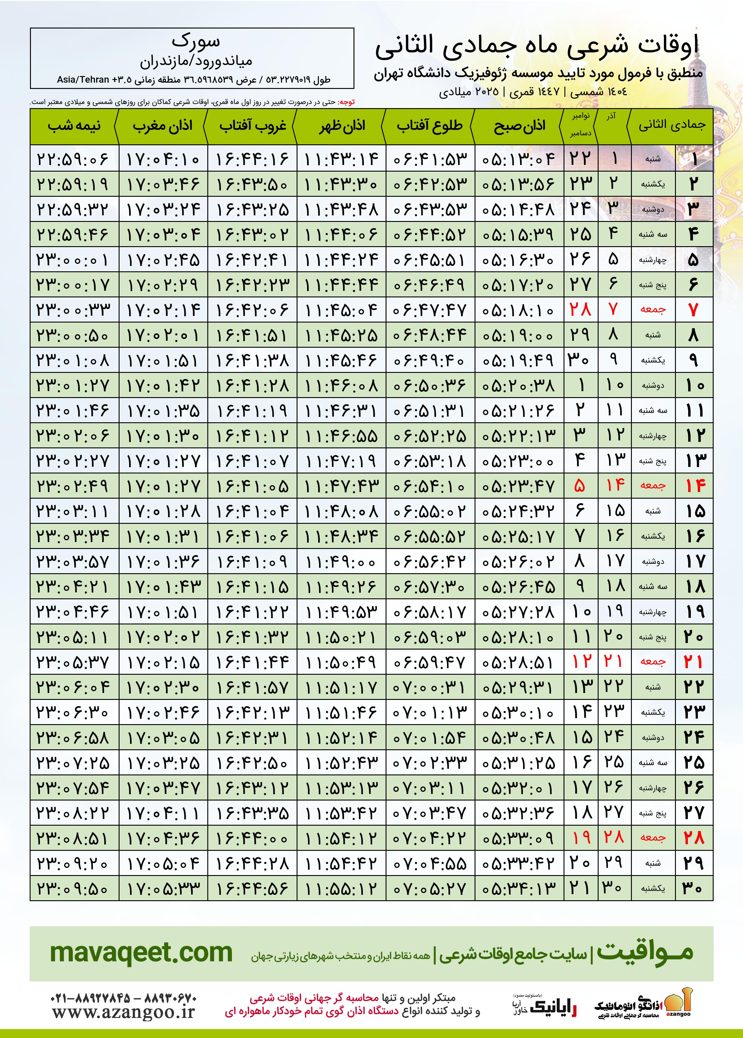 جدول اوقات شرعی جمادی الثانی ١٤٤٧ قمری شهر سورک