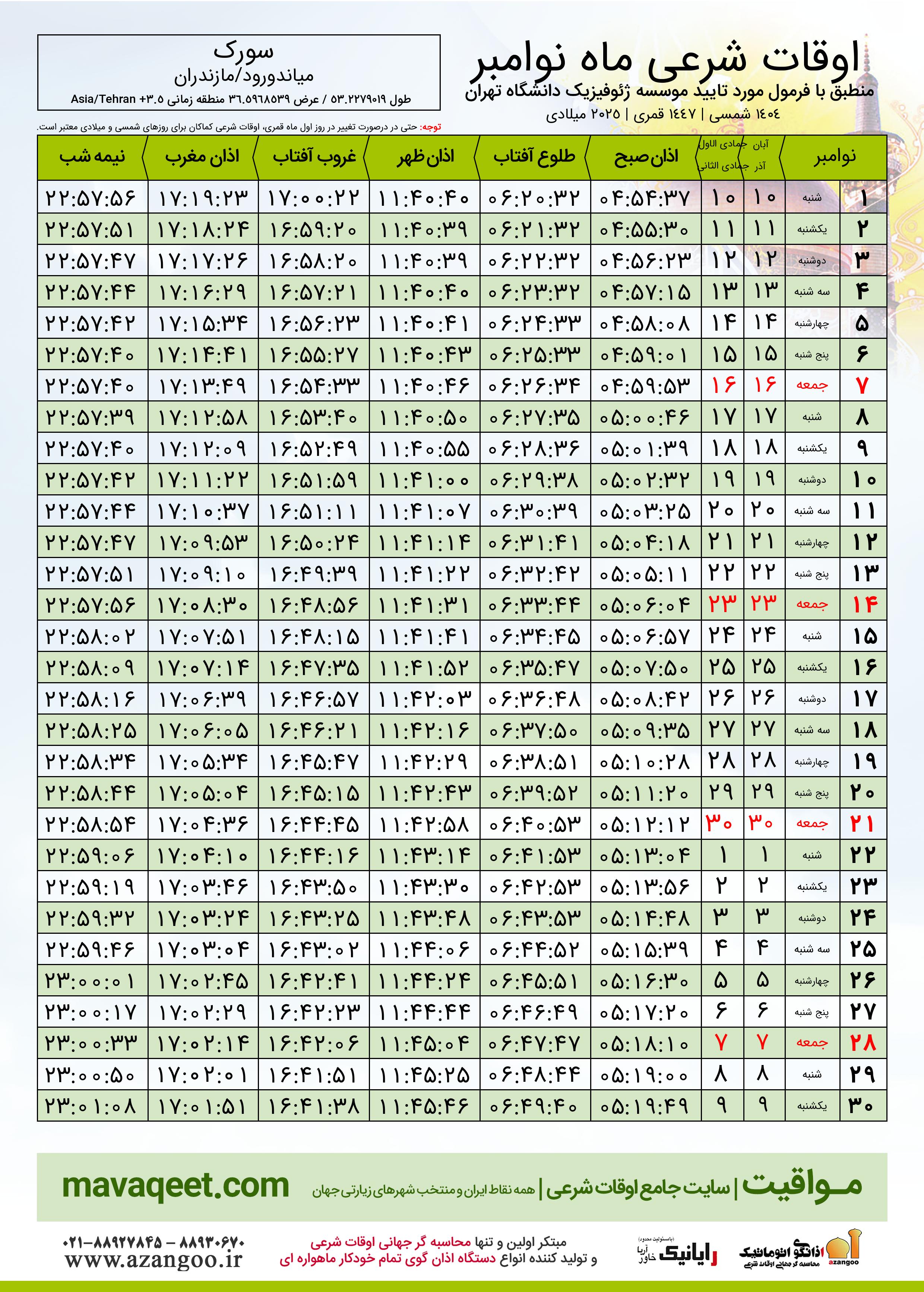جهت نمایش تصویر جدول اوقات شرعی جدول اوقات شرعی نوامبر ٢٠٢٥ میلادی شهر سورک شهر سورک در اندازه